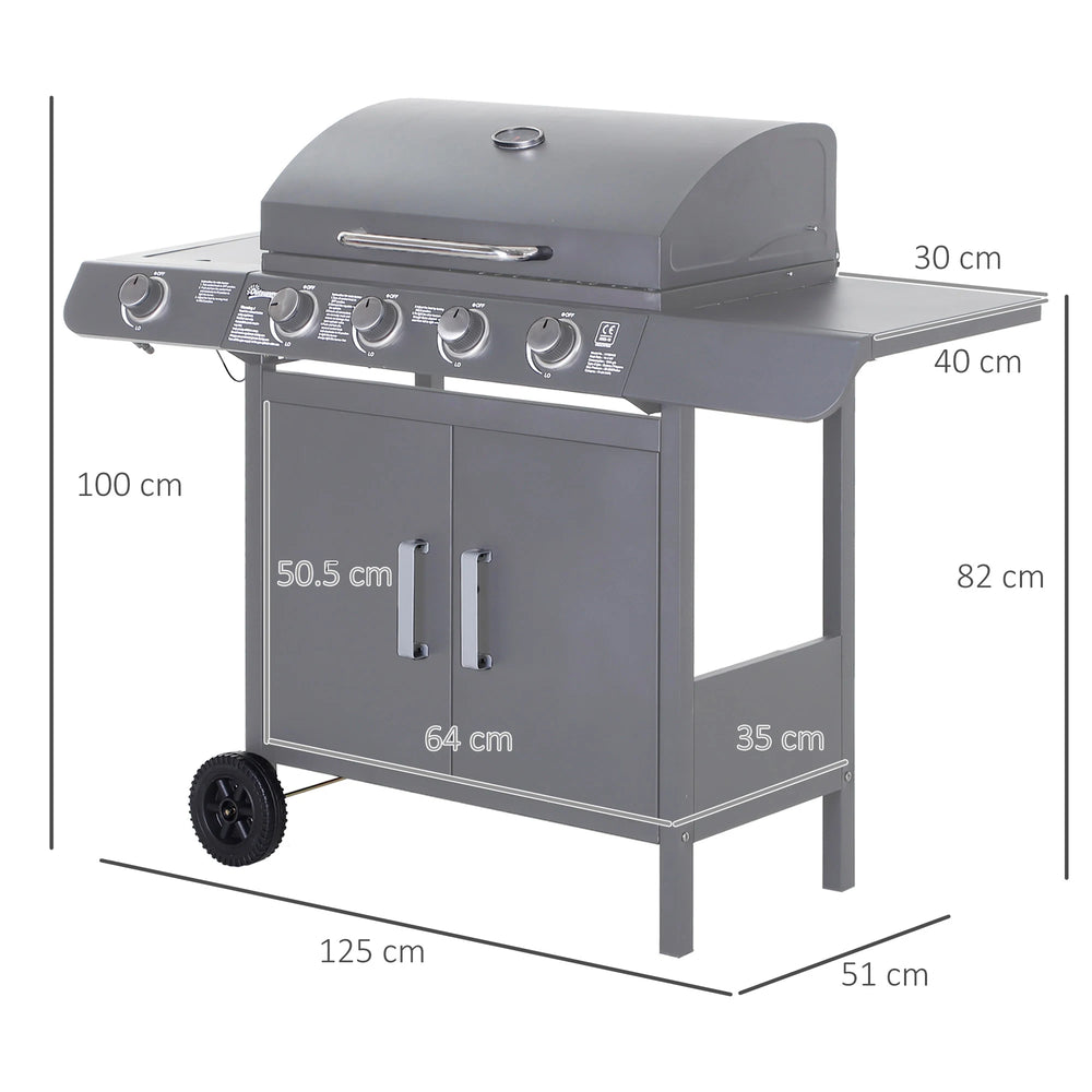 Outsunny 4+1 Burner Gas BBQ Grill, Outdoor Barbecue Trolley with Wheels, Warming Rack, Side Shelves, Cabinet, Thermometer for Garden, Party, Camping, 125 L x 51 W x 100 H cm, Grey