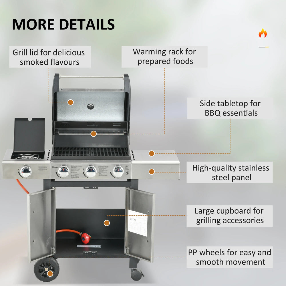 Outsunny Gas Barbecue Grill 3+1 Burner Garden Smoker BBQ Trolley w/ Side Burner Warming Rack Side Shelves Storage Cabinet Piezo Ignition Thermometer Stainless Steel + Metal