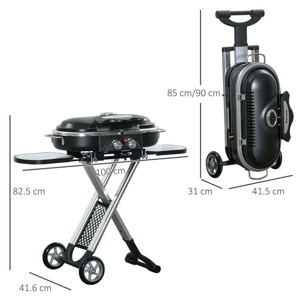 Outsunny Foldable Gas BBQ Grill 2 Burner Garden Barbecue Trolley w/ Lid Side Shelves Storage Pocket Piezo Ignition Thermometer, Aluminium Alloy