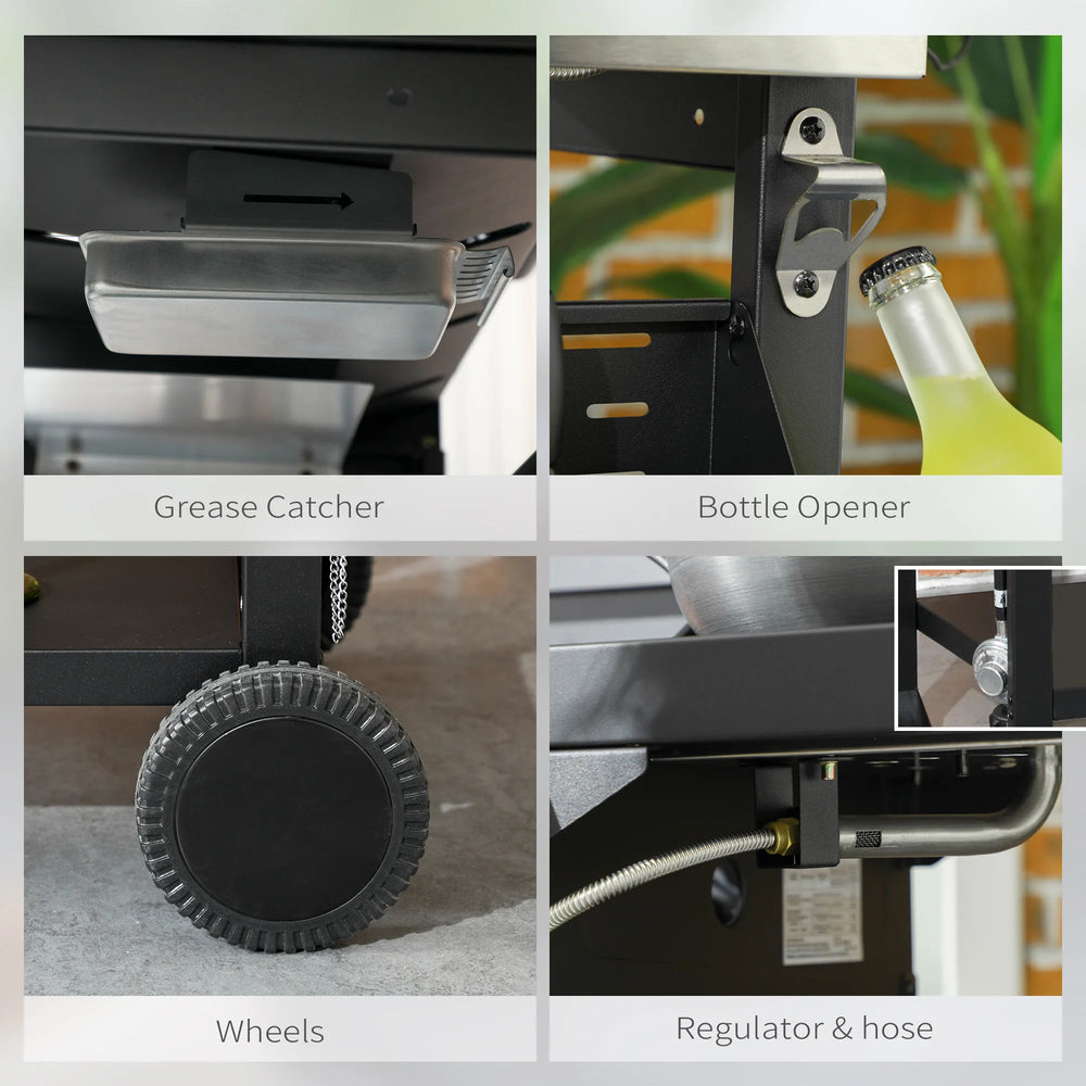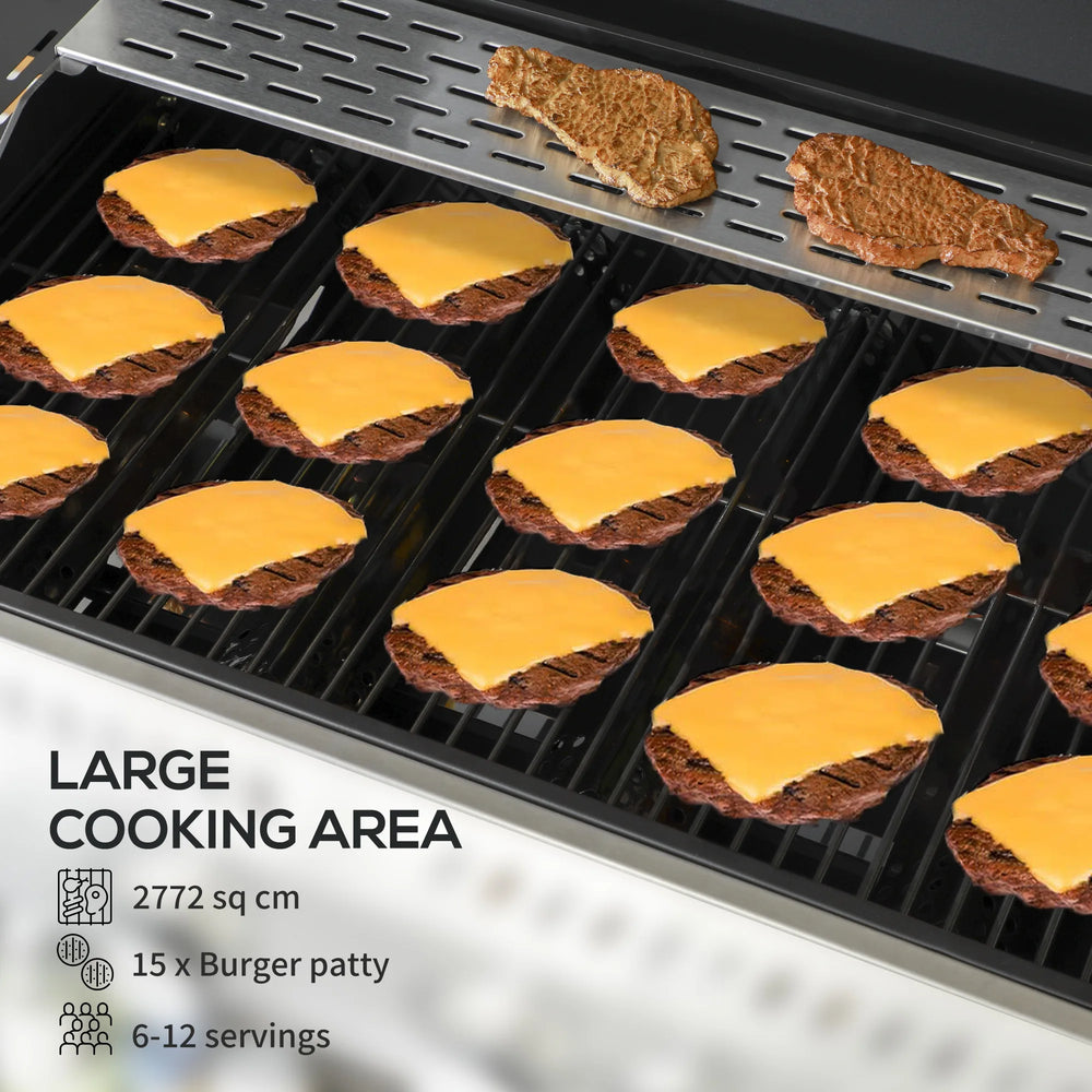 Get friends together and delicious BBQ food with this Outsunny grill. It features five independent burners, controlled by piezo ignition for easy, separate operation. The large 2772cm2 grilling area is enough for 6-12 people party. Cleanup is hassle-free with the grease catcher, with the built-in bottle opener for beers. Have freshly cooked food at your fingertips, whenever.