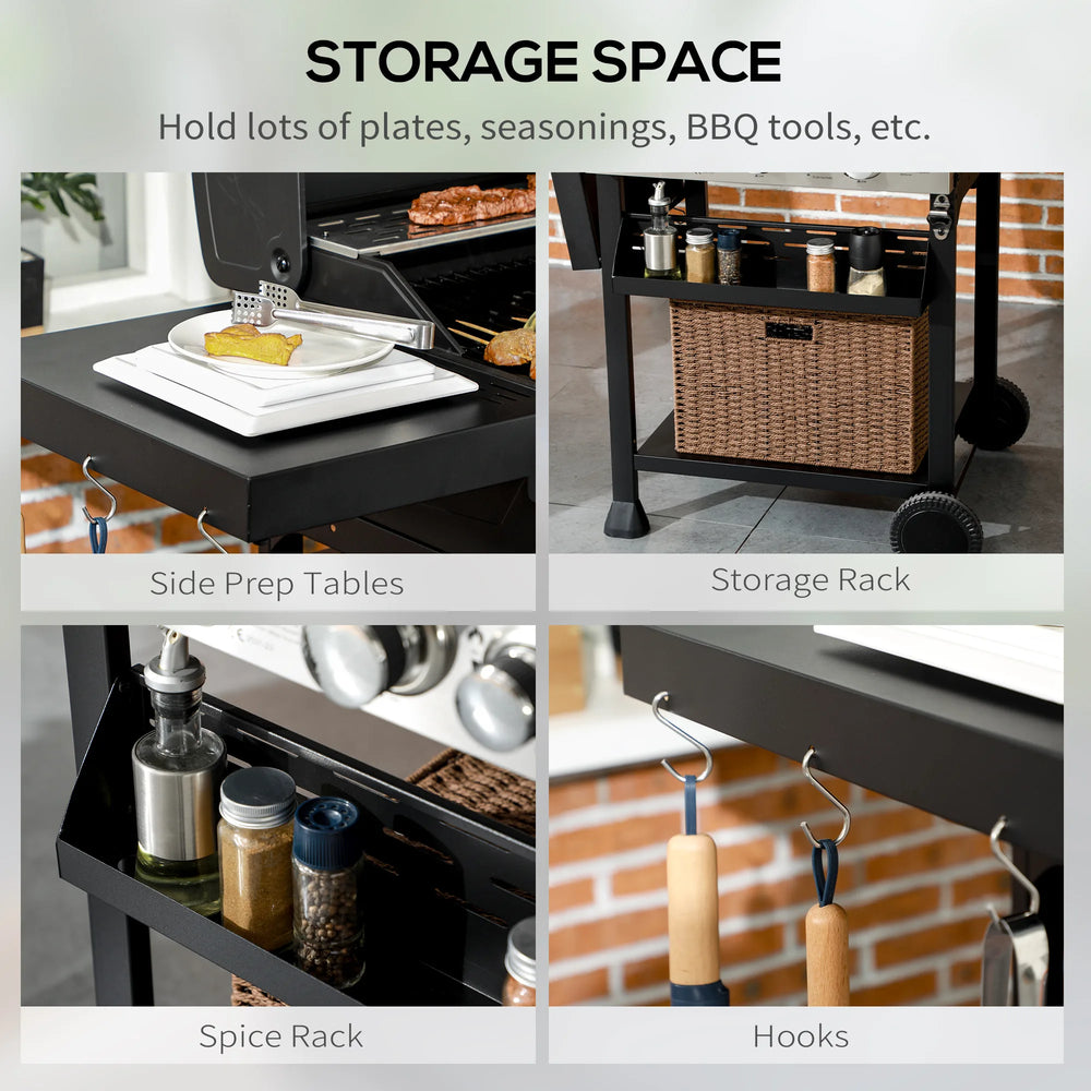 - Multiple storage: Storage rack beside and underneath the bbq trolley, with front spice rack and side hooks.