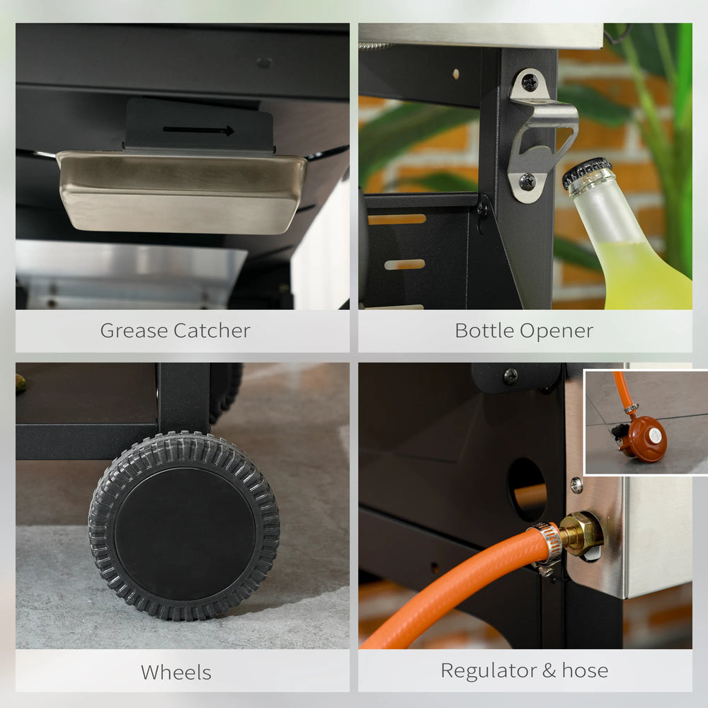 Get friends together and delicious BBQ food with this Outsunny grill. It features four independent burners, controlled by piezo ignition for easy, separate operation. The large 2282cm2 grilling area is enough for 5-10 people party. Cleanup is hassle-free with the grease catcher, with the built-in bottle opener for beers. Have freshly cooked food at your fingertips, whenever.