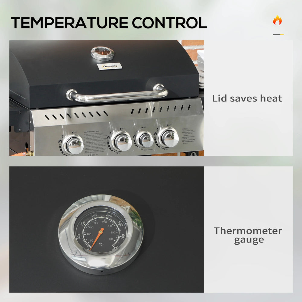 Outsunny Four-Burner Steel Gas Grill, with Thermometer - Black