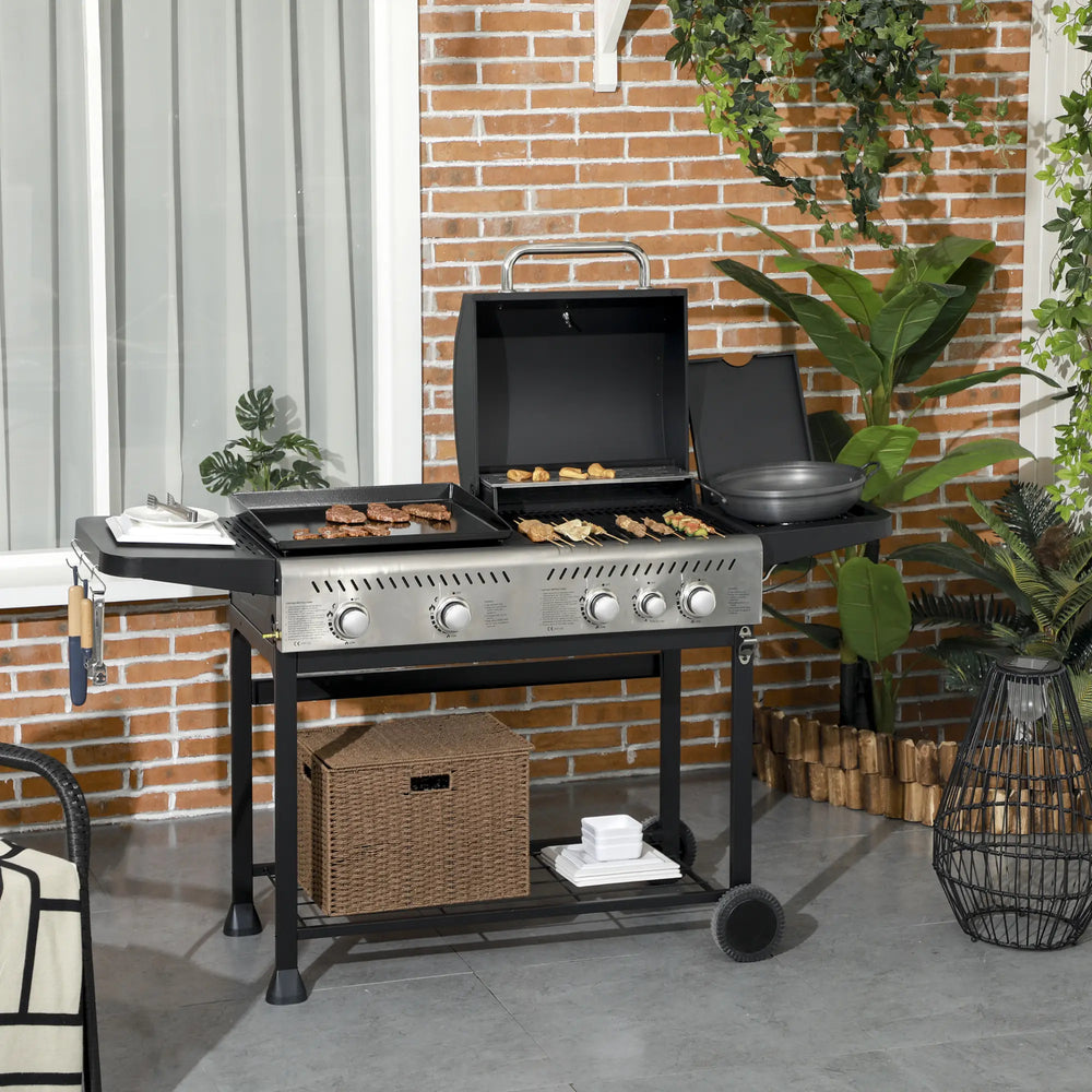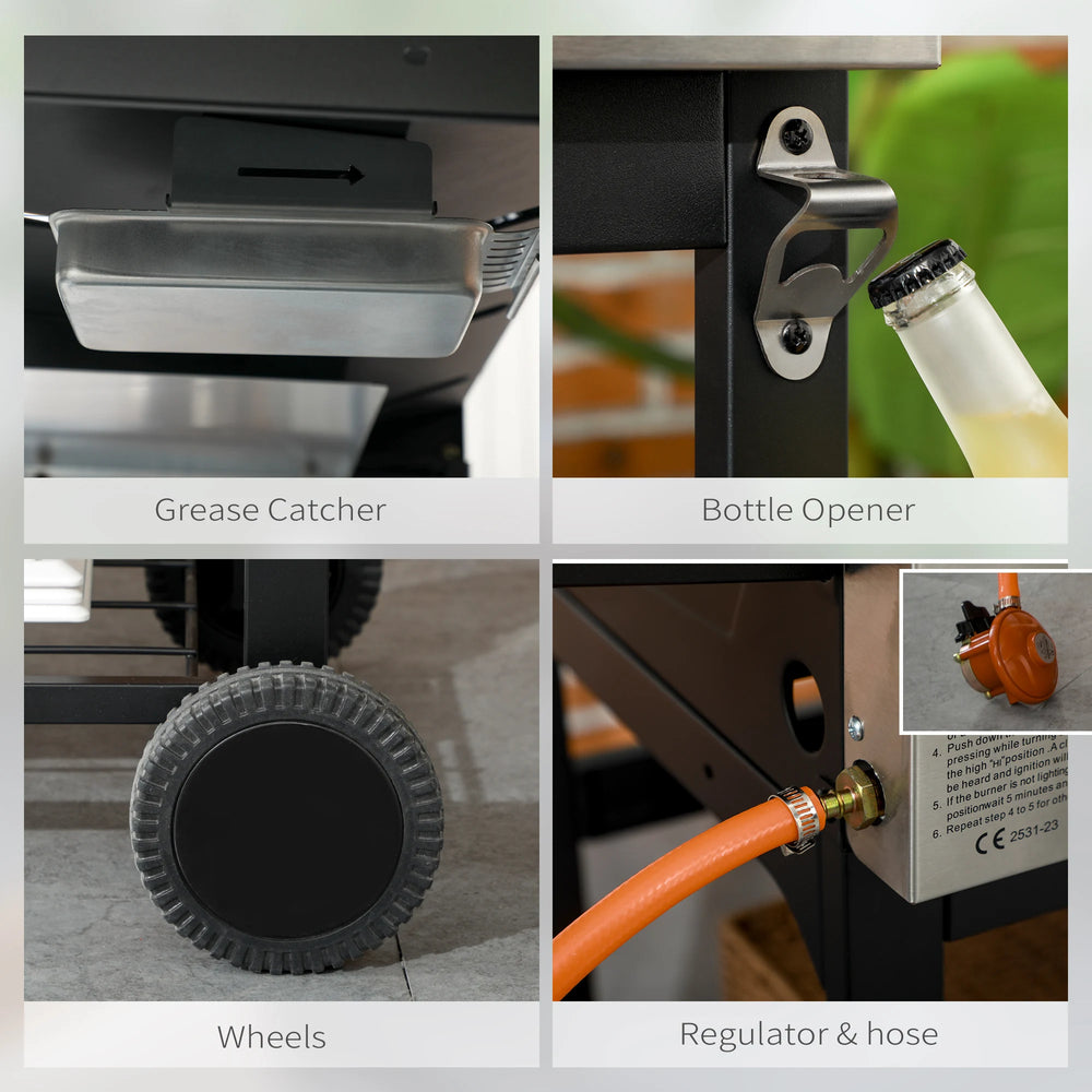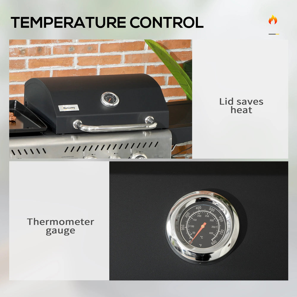 Sizzle and sear like a pro with this Outsunny deluxe BBQ. The two-in-one design combines a gas bbq and plancha grill. The 3825cm2 cooking surface is large enough to cook 8-16 servings. Gas grill features a lid: control the smokiness, with the thermometer to see inside temperature easily. Use the side burner to add extra sizzle. Complete with two wheels to move around easily.