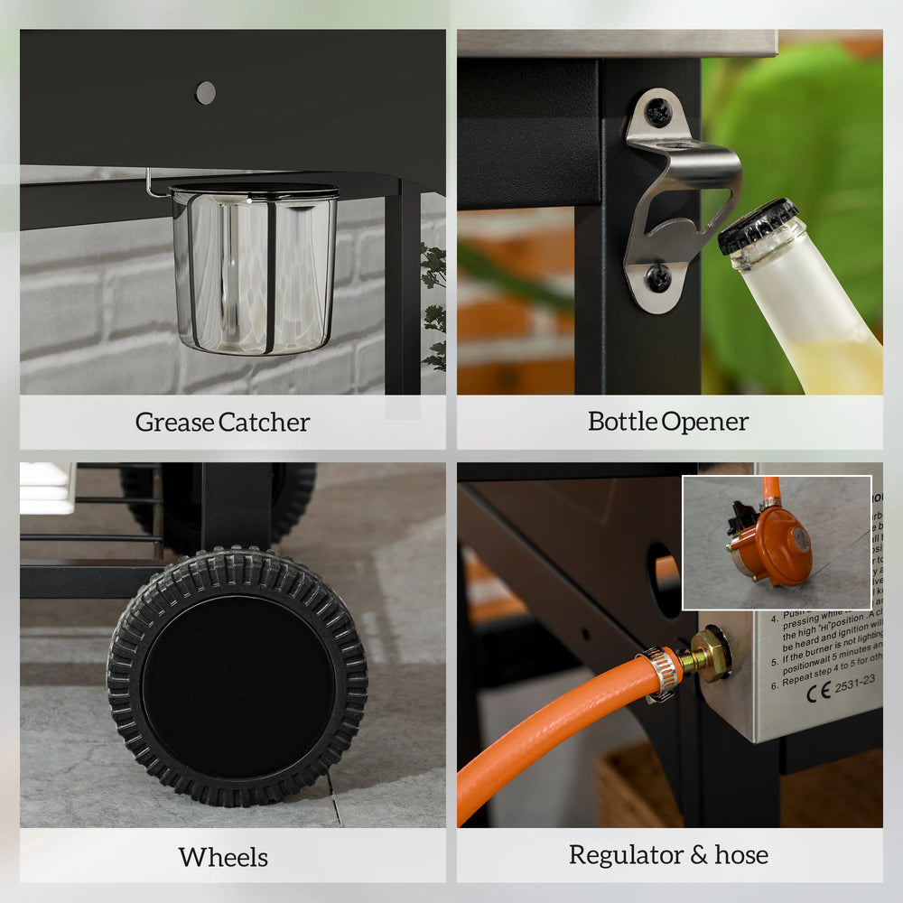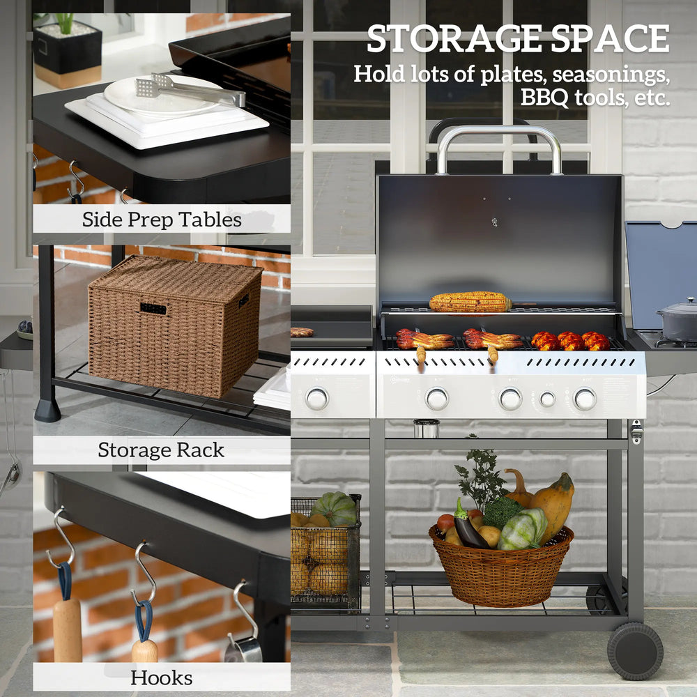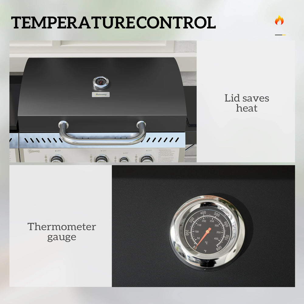 Sizzle and sear like a pro with this Outsunny deluxe BBQ. The two-in-one design combines a gas bbq and plancha grill. The 5565 cm2 cooking surface is large enough to cook 12-20 servings. Gas grill features a lid: control the smokiness, with the thermometer to see inside temperature easily. Use the side burner to add extra sizzle. Complete with two wheels to move around easily.