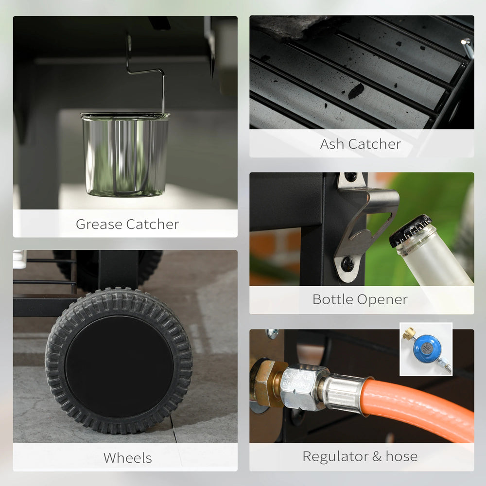 Fire up your garden parties with the versatile Outsunny charcoal and gas combo grill! The charcoal grill with lid can make authentic smoky flavour and a 2-burner gas grill for convenient cooking. A handy side burner adds extra cooking flexibility. With a spacious cooking area, it's enough for feeding 8-16 people, making it the centrepiece of any social gathering.