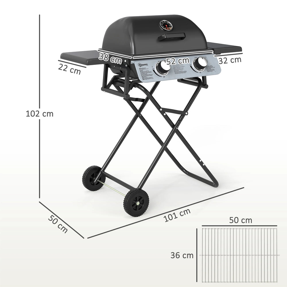 Enjoy delicious BBQ food in cool style, with this Outsunny suitcase-style gas grill. It features two main burners to cook different foods, at different temperatures - cook a complete meal; controlled by easy-use piezo ignition. The two side tables keep BBQ ingredients and seasonings within reach. Complete with an easy-read thermometer on the lid for heat control. When done, just fold the grill and pull the handle; moves smoothly with the two wheels.