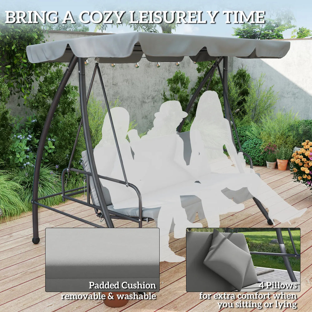 Outsunny Outdoor 2-in-1 Swing Chair Lounger 3 Seater Garden Swing Seat Bed Convertible Tilt Canopy W/ Cushion, Light Grey