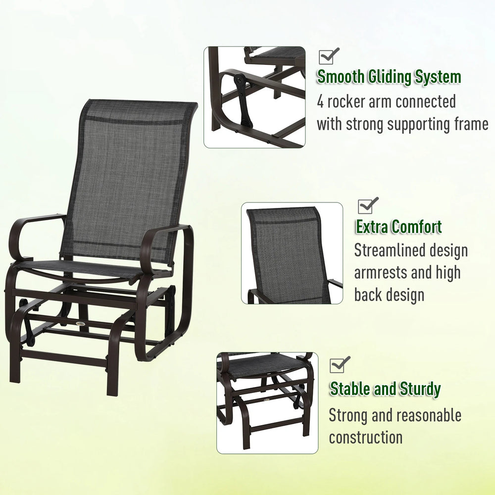 Outsunny 3 Pieces Garden Gliding Chair Set, Metal Frame 2 Single Armchair Swing Seater and 1 Glass Top Coffee Table w/ Breath Mesh Fabric Seat, Brown