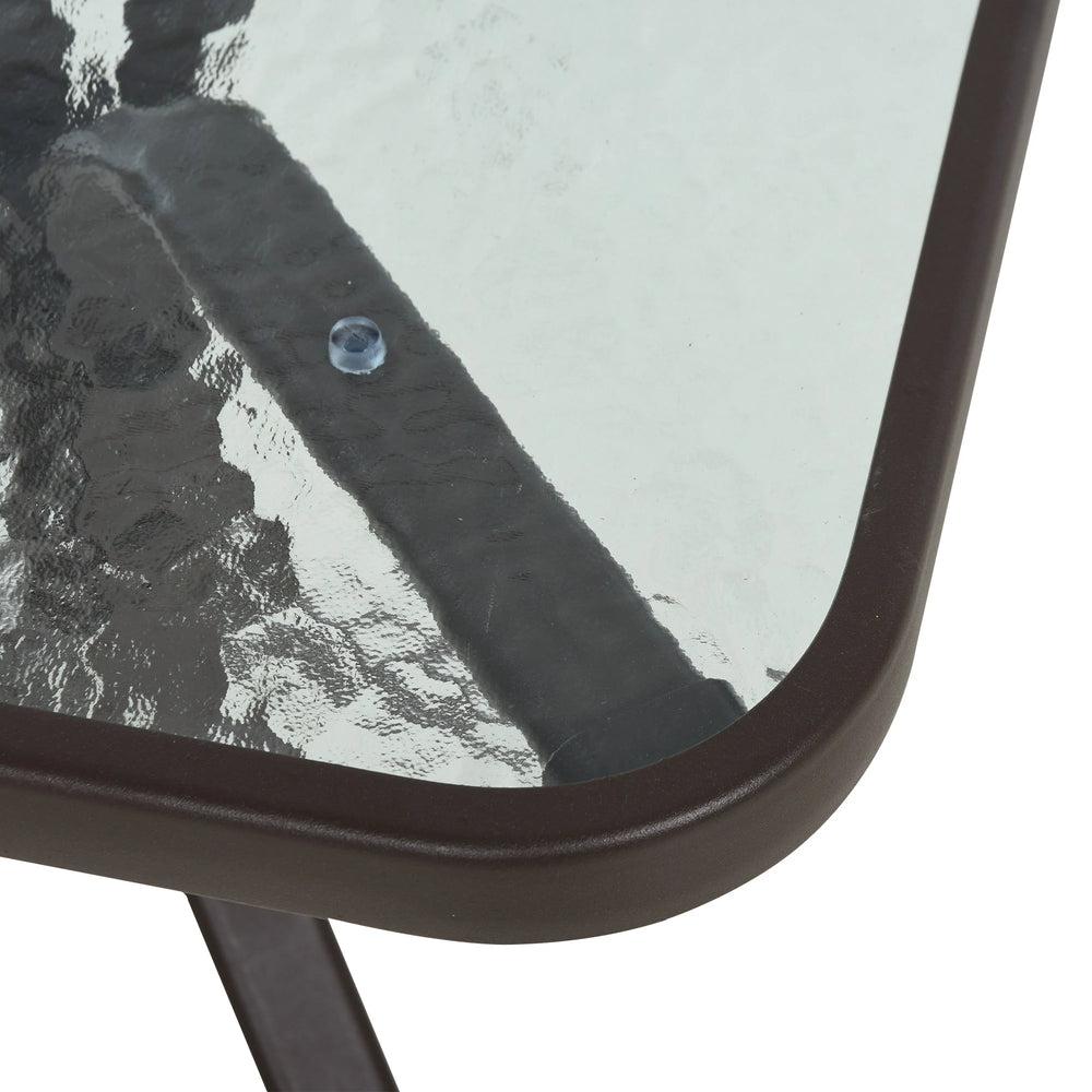 - THREE-PIECE SET: Comes with two outdoor chairs and a matching table. Chairs feature armrests and tall backs for support. Safe, tempered glass on table for a handy resting place.