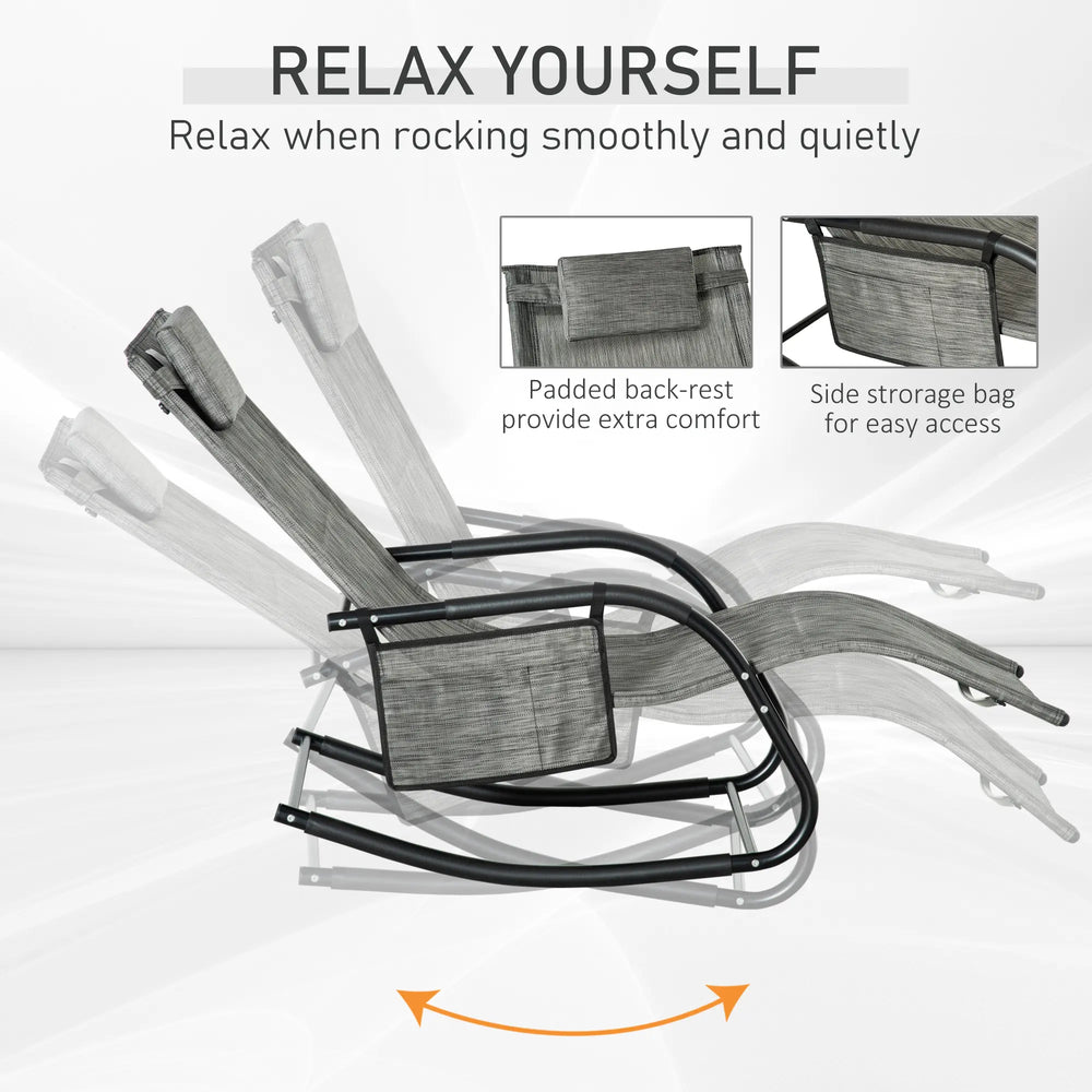 Outsunny Outdoor Garden Rocking Chair, Patio Sun Lounger Rocker Chair with Breathable Mesh Fabric, Removable Headrest Pillow, Armrest, Side Storage Bag, Dark Grey