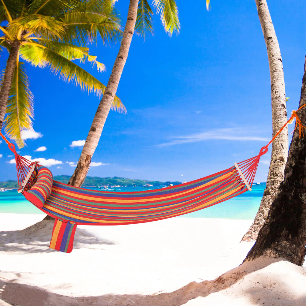 Outsunny Cotton Hammock Soft Portable Swing Sleeping w/ Headrest & Side Pocket Deluxe Swing Chair for Beach, Yard, Bedroom, Patio, Porch, Indoor, Outdoor,270 x 80 cm