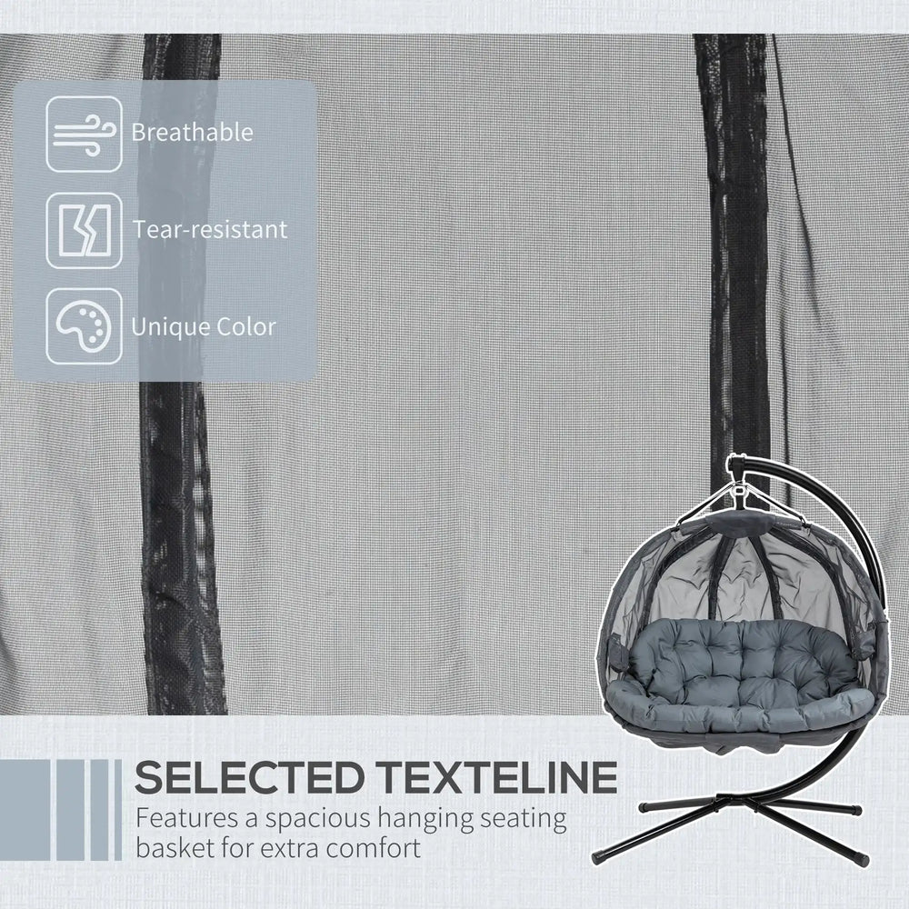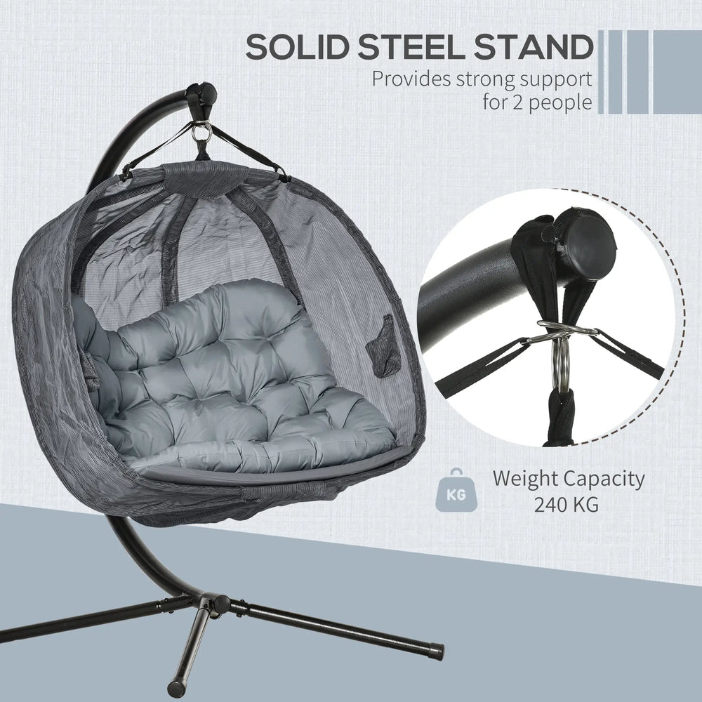Outsunny Double Hanging Egg Chair 2 Seaters Texteline Swing Hammock Chair with Stand, Cushion and Folding Design, for Indoor and Outdoor, Grey