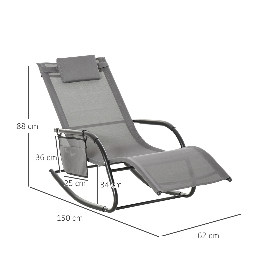 Outsunny 2PCs Outdoor Garden Rocking Chair, Patio Sun Lounger Rocker Chair with Breathable Mesh Fabric, Removable Headrest Pillow, Armrest, Side Storage Bag, Grey
