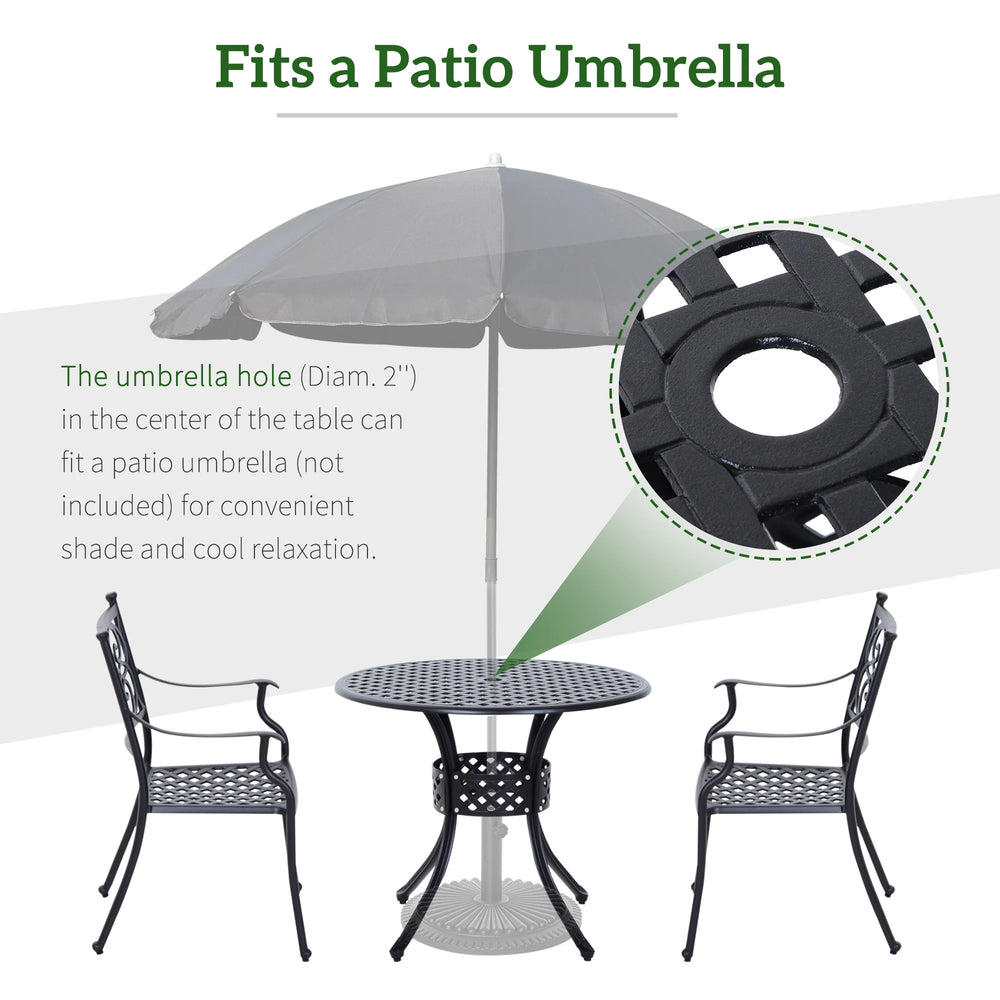 Outsunny's round garden table is a great solution for seating up to four people for a sit-down meal outside. Water-safe cast aluminium frame is for durability and longevity. It has metal-work grid motifs and a convenient centre umbrella hole to add shade with a matching umbrella. The grid top design helps drain away rainwater, while its versatile style can be paired with various seating options. Embrace the outdoors, relax in comfort and choose Outsunny for your outdoor dining needs.