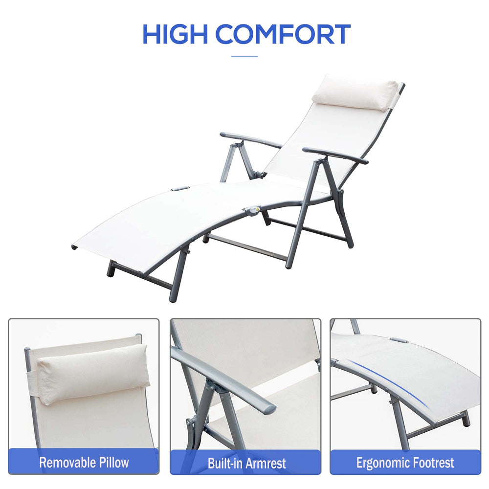 Outsunny Sun Lounger Steel Frame Outdoor Folding Chaise Texteline Lounge Chair Recliner with Headrest & 7 Levels Adjustable Backrest, Cream White