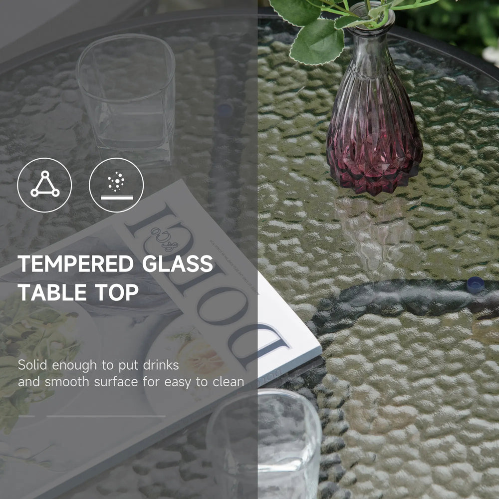 The 3-piece outdoor garden patio furniture set from Outsunny includes a tempered glass-top table and 2 folding chairs. The table base features 4 claw-shaped legs, which makes it sturdy and steady. The folding chair features 4 adjustable backrest positions, which allows you to find the perfect position to relax. It is an ideal way to enjoy a cafe-style experience right outside your own door with Outsunny.