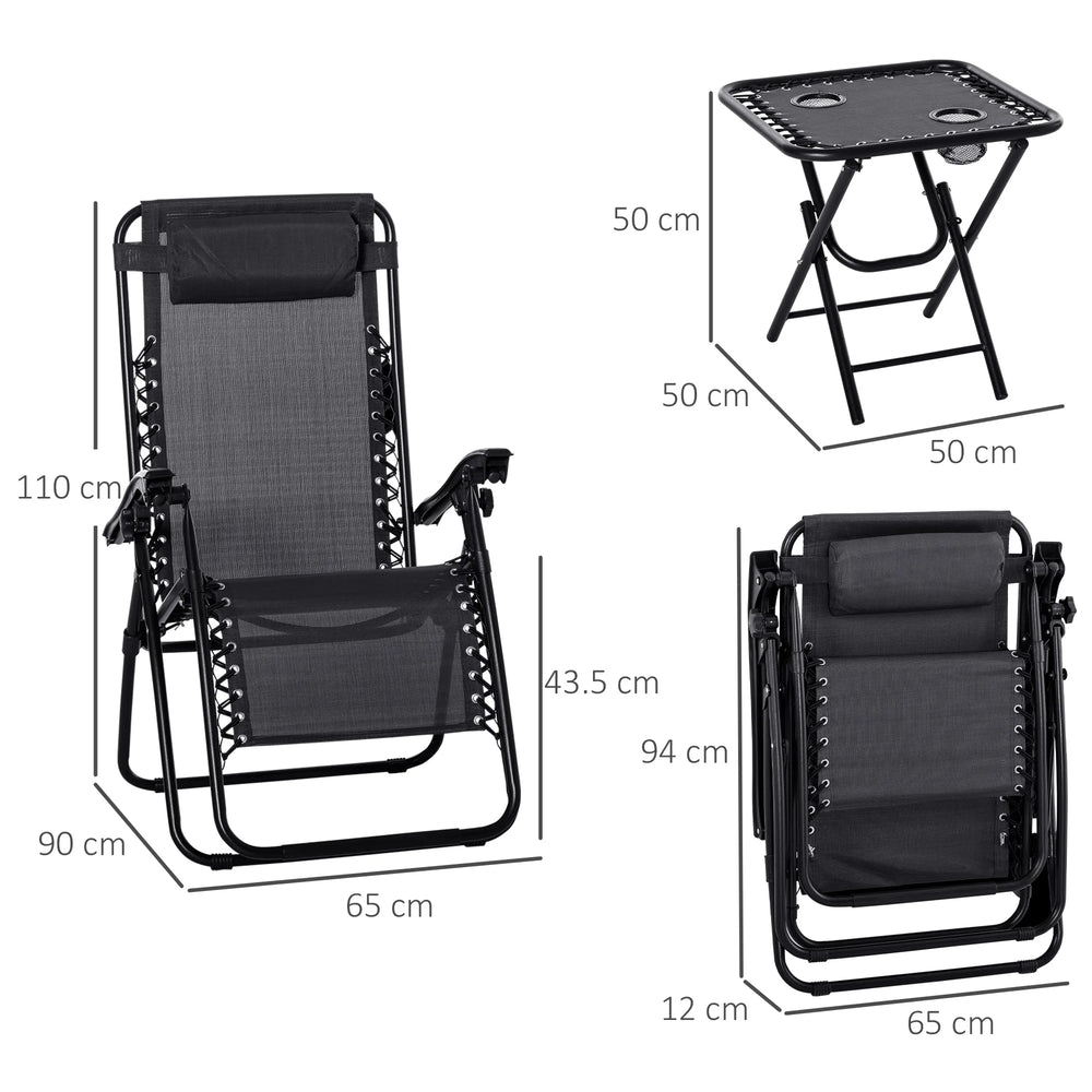 Outsunny Folding Zero Gravity Chairs, 3 Pieces Adjustable Sun Lounger and Table Set with Cup Holder and Headrest, Patio Bistro Set with Reclining Garden Chairs for Outdoor, Black