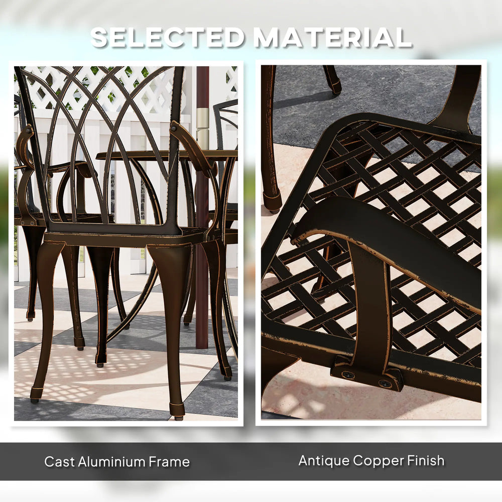 Outsunny 5 Pieces Garden Dining Set for 4, Cast Aluminium Outdoor Dining Set with 4 Armchairs and Round Dining Table with Parasol Hole, Garden Furniture Set, Bronze Tone