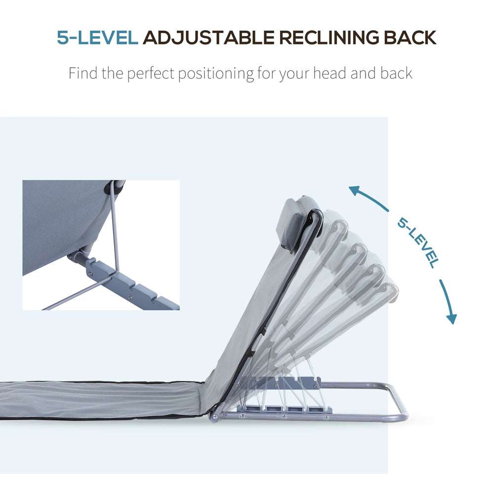 Outsunny Set of 2 Foldable Garden Beach Chair Mat Lightweight Outdoor Sun Lounger Seats Adjustable Back Metal Frame PE Fabric Head Pillow w/ Carry Bag,Grey