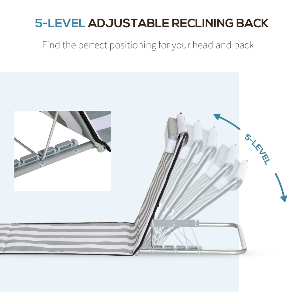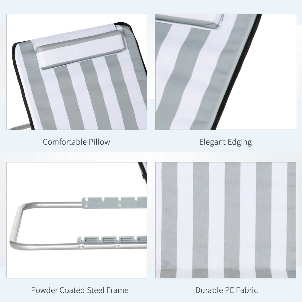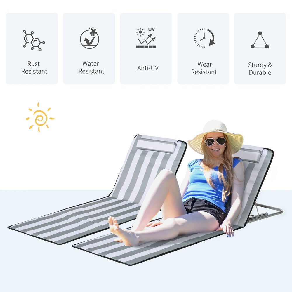 Outsunny Set of 2 Foldable Garden Beach Chair Mat Lightweight Outdoor Sun Lounger Seats Adjustable Back Metal Frame PE Fabric Head Pillow w/ Carry Bag, Light Grey