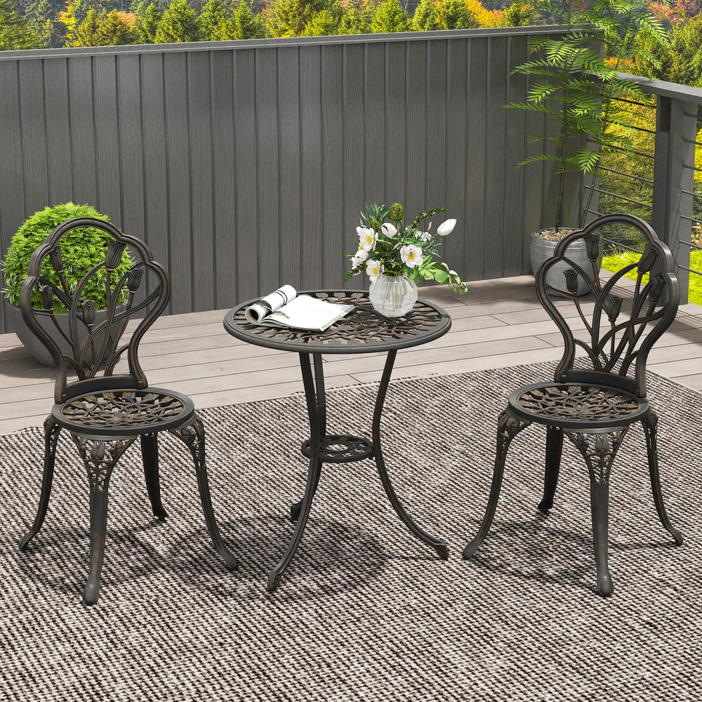 Enjoy outdoor times with some vintage charm, with this Outsunny three-piece bistro set. The hollow-carved tulips design is beautiful. Made from cast aluminium for long-term use. The table of this garden set features an umbrella hole, so you can all keep shaded from a parasol safely when it's sunny.