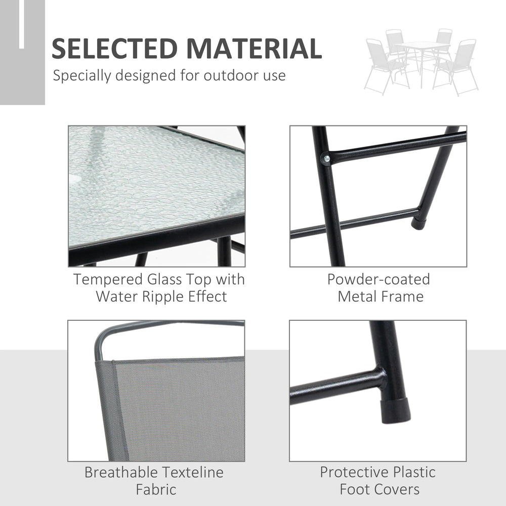 Outsunny 5 Piece Garden Dining Set Outdoor Dining Furniture 4 Folding Chairs, Glass Top Table with Parasol Hole, Texteline Seats, Black
