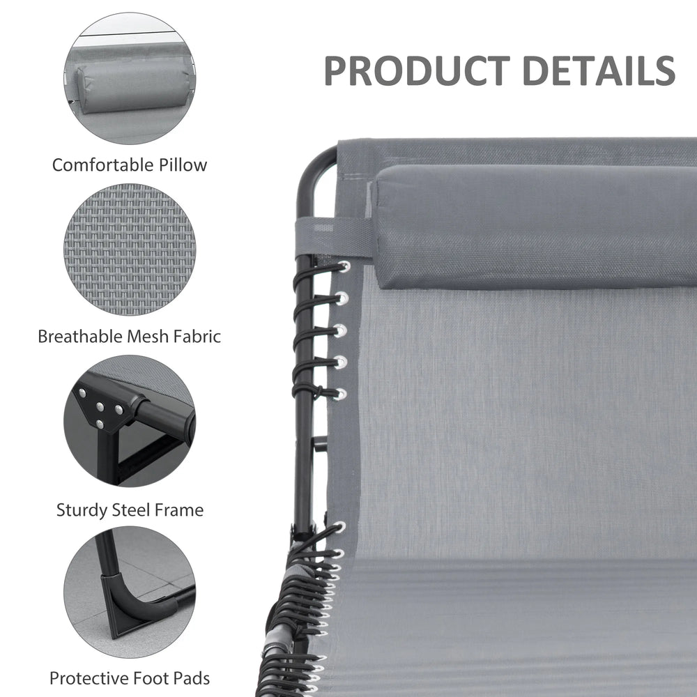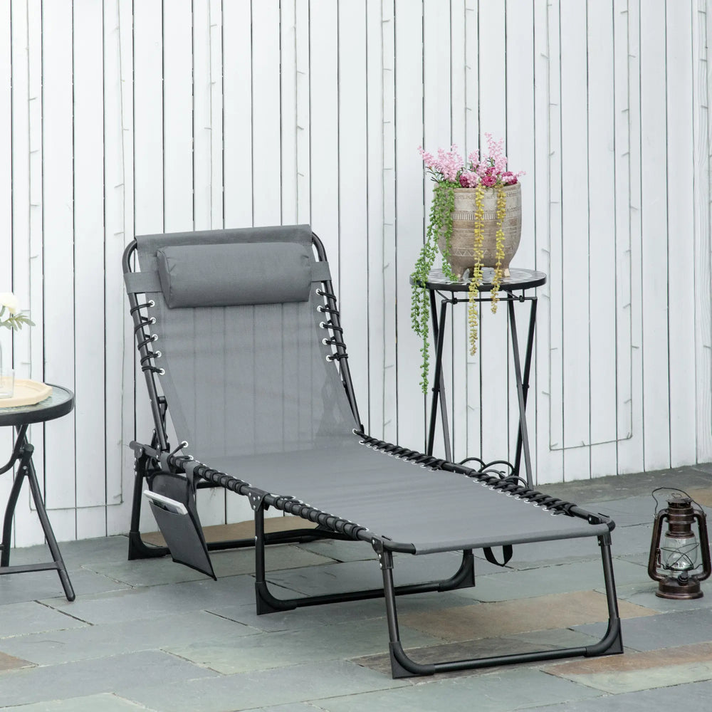 Outsunny Portable Sun Lounger, Folding Camping Bed Cot, Reclining Lounge Chair 5-position Adjustable Backrest with Side Pocket, Pillow for Patio Garden Beach Pool, Grey