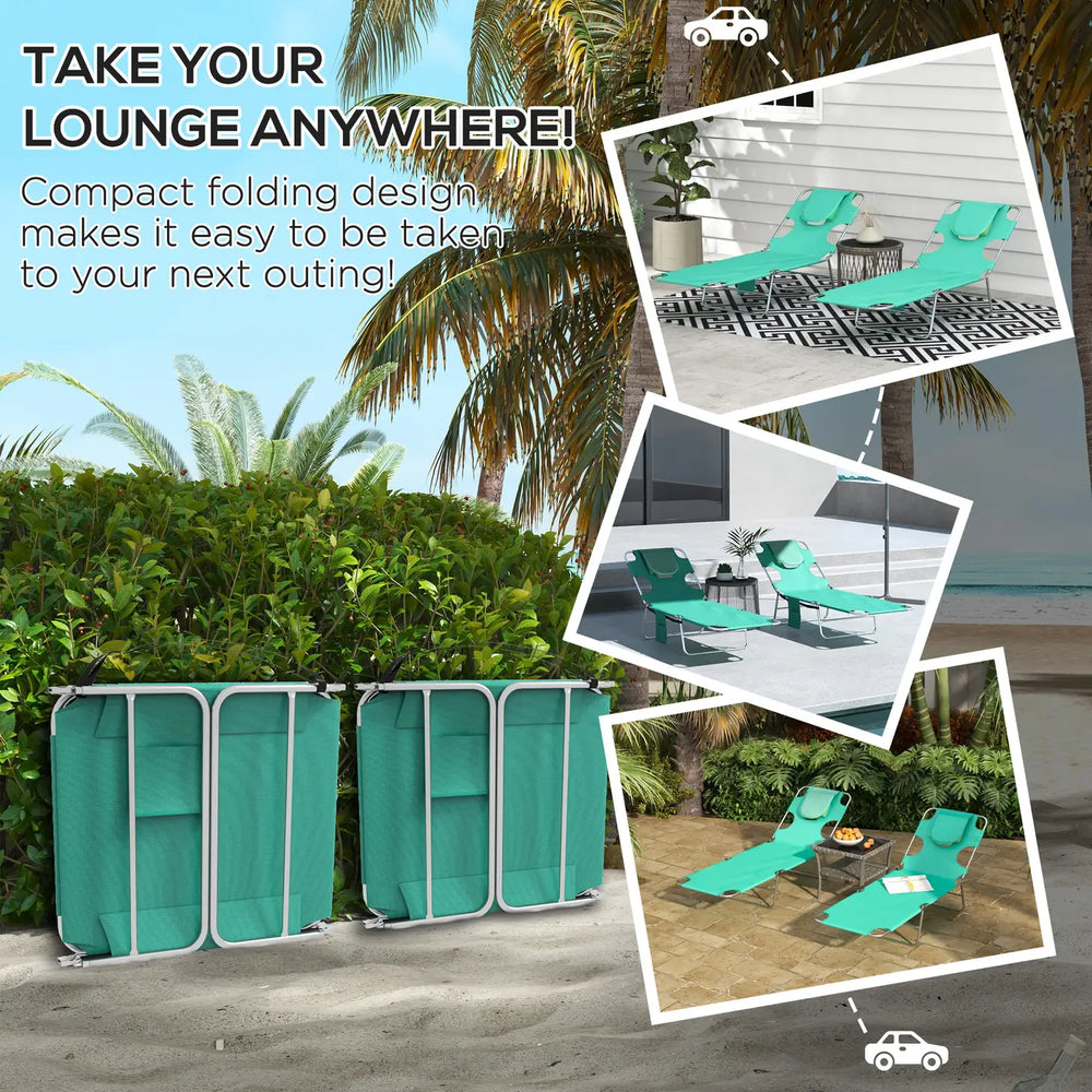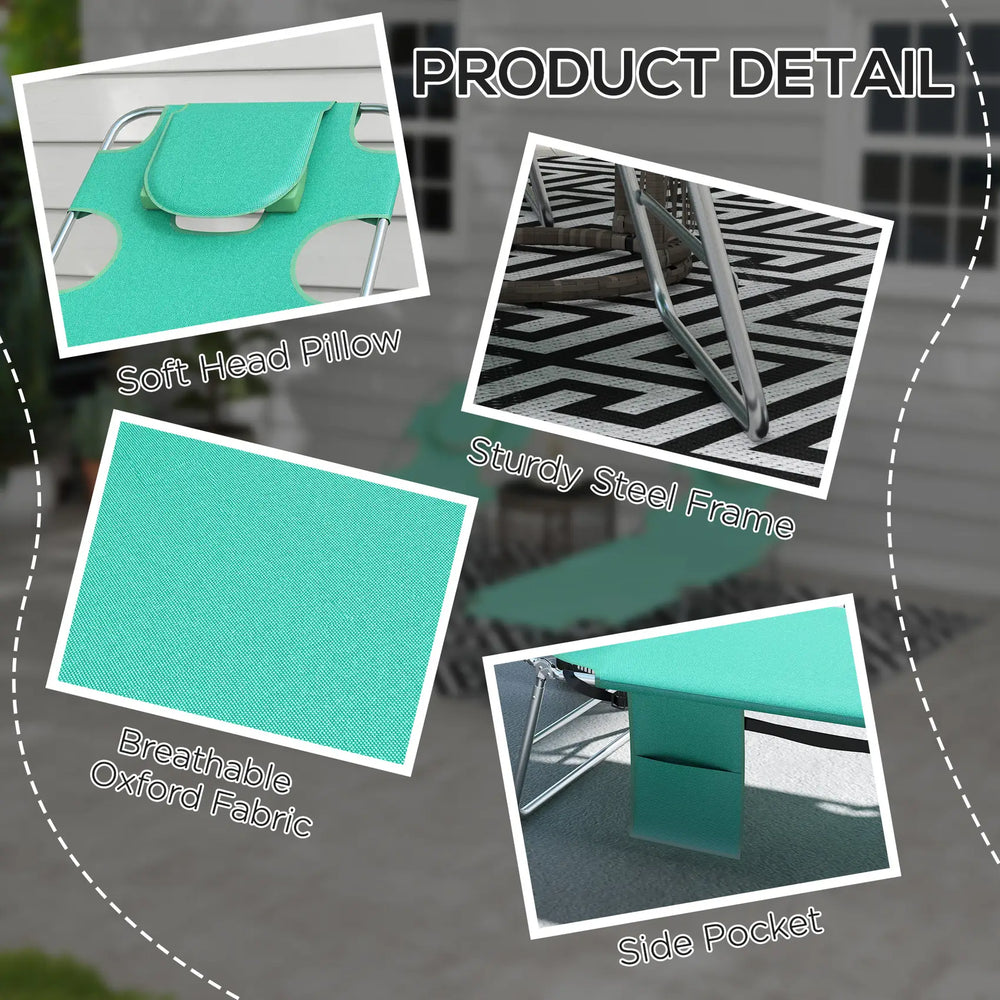 Outsunny Foldable Sun Lounger Set of 2 with Reading Hole, Portable Sun Lounger with 5 Level Adjustable Backrest, Reclining Lounge Chair with Side Pocket, Headrest Pillow, Green