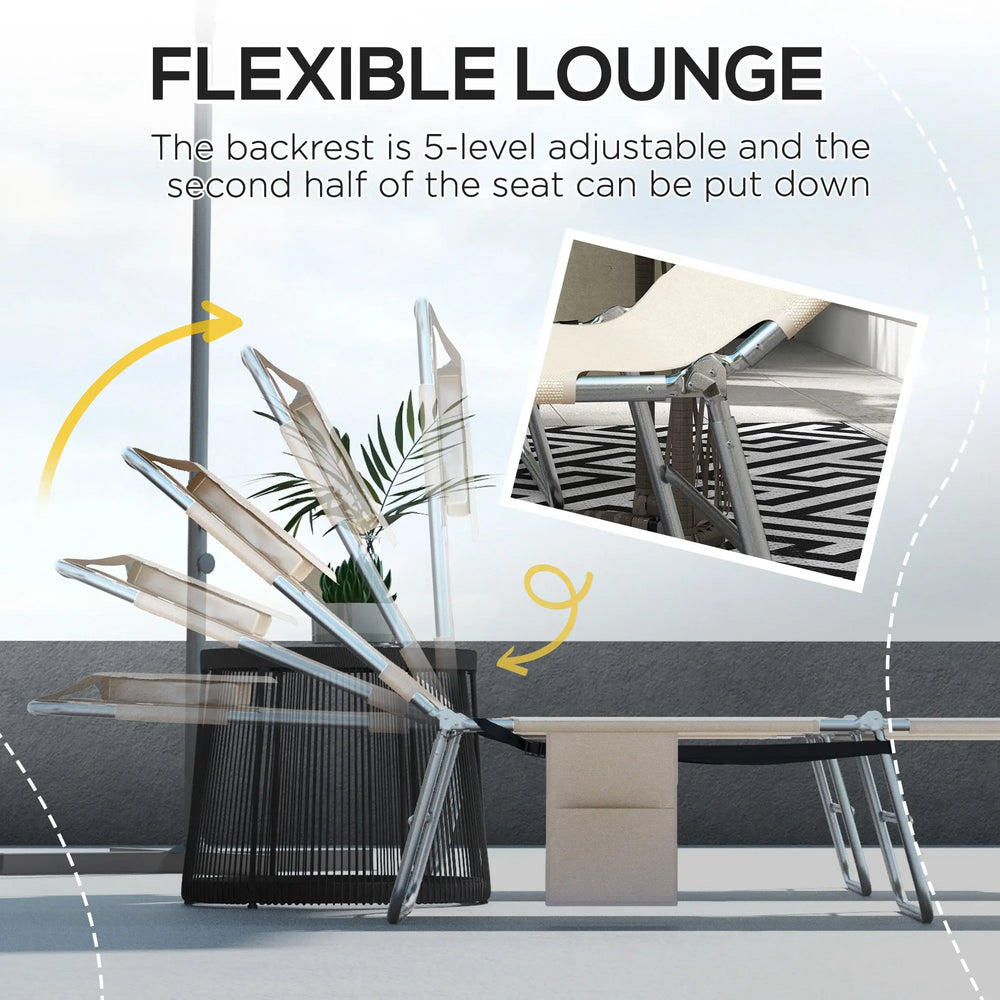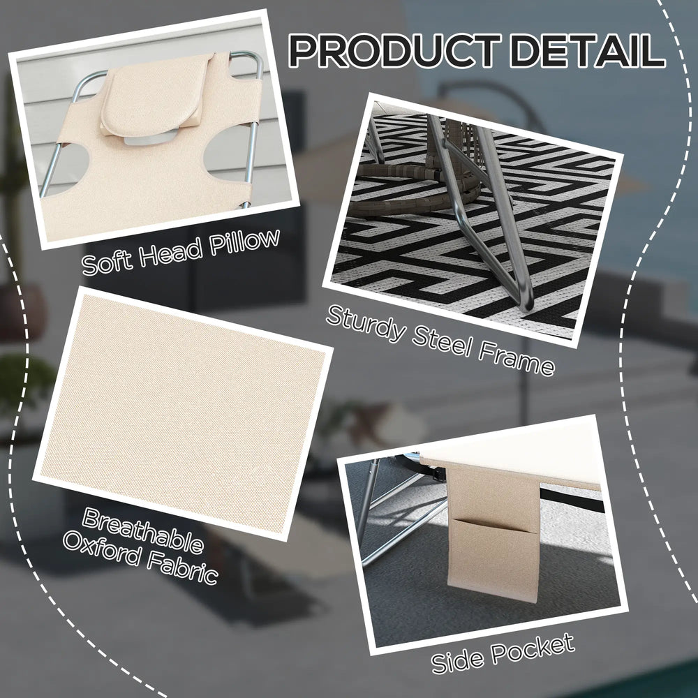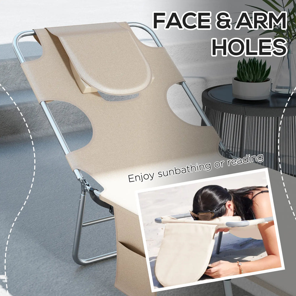 Outsunny Foldable Sun Lounger Set of 2, Beach Chaise Lounges with Reading Hole, Arm Slots, 5-Position Adjustable Backrest, Side Pocket, Pillow for Patio, Garden, Beach, Pool, Beige