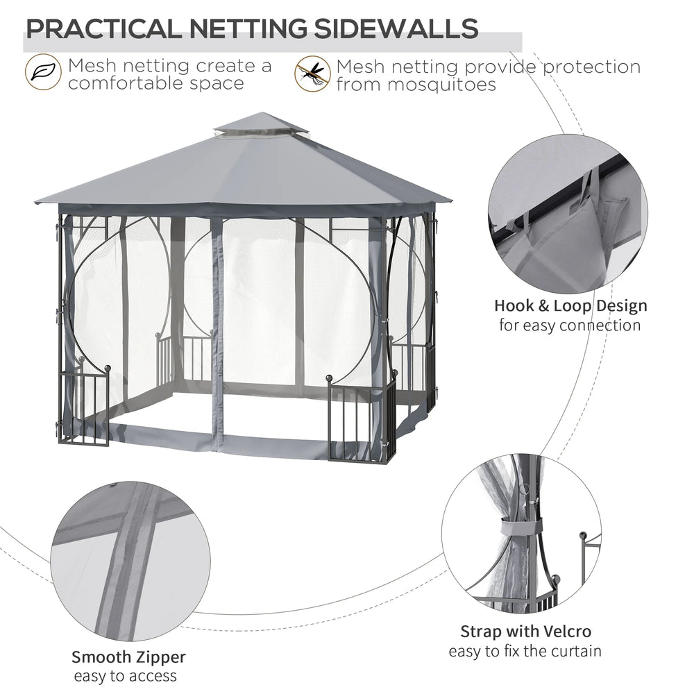 Outsunny 3 x 3(m) Garden Gazebo Patio Party Tent Shelter Outdoor Canopy Double Tier Sun Shade Metal Frame Netting, Light Grey
