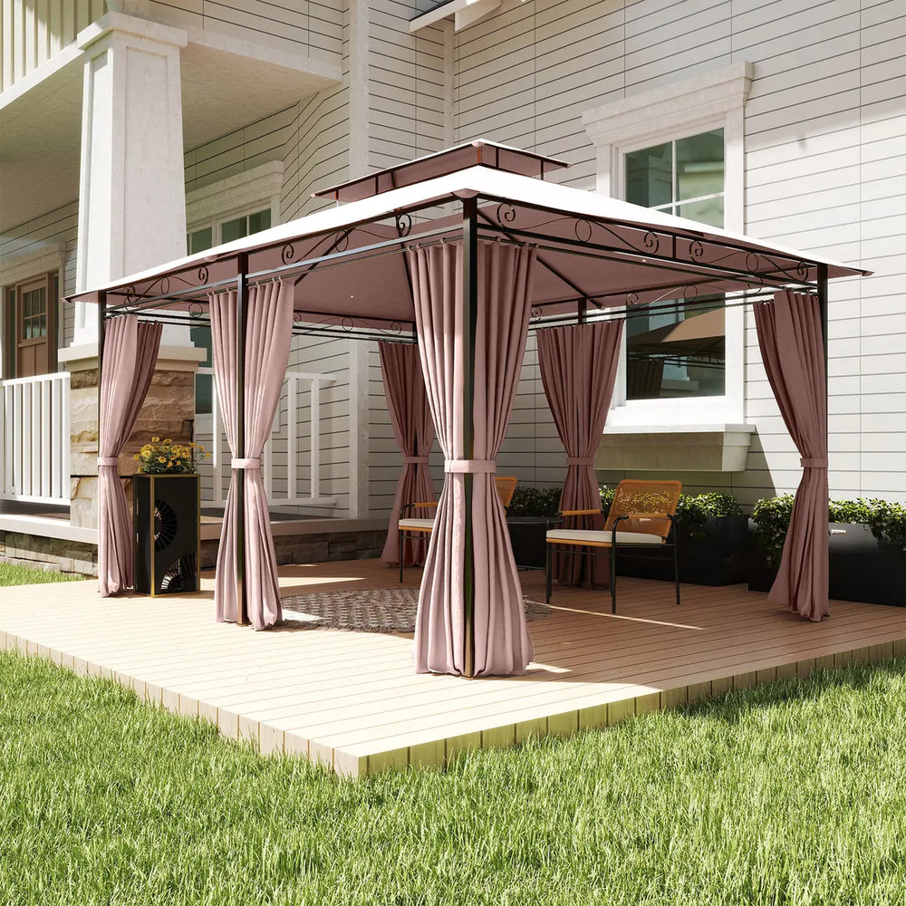 Outsunny 4m x 3(m)Garden Gazebo, Double Roof Outdoor Gazebo Canopy Shelter with Curtains, Solid Steel Frame for Patio, Garden, Brown
