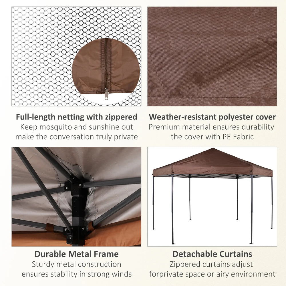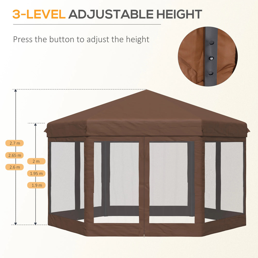 Outsunny 3.5m x 4m Hexagonal Pop Up Gazebo, Canopy Tent Sun Shelter for Patio Outdoor Party, Height Adjustable, with Mosquito Netting and Carry Bag - Brown