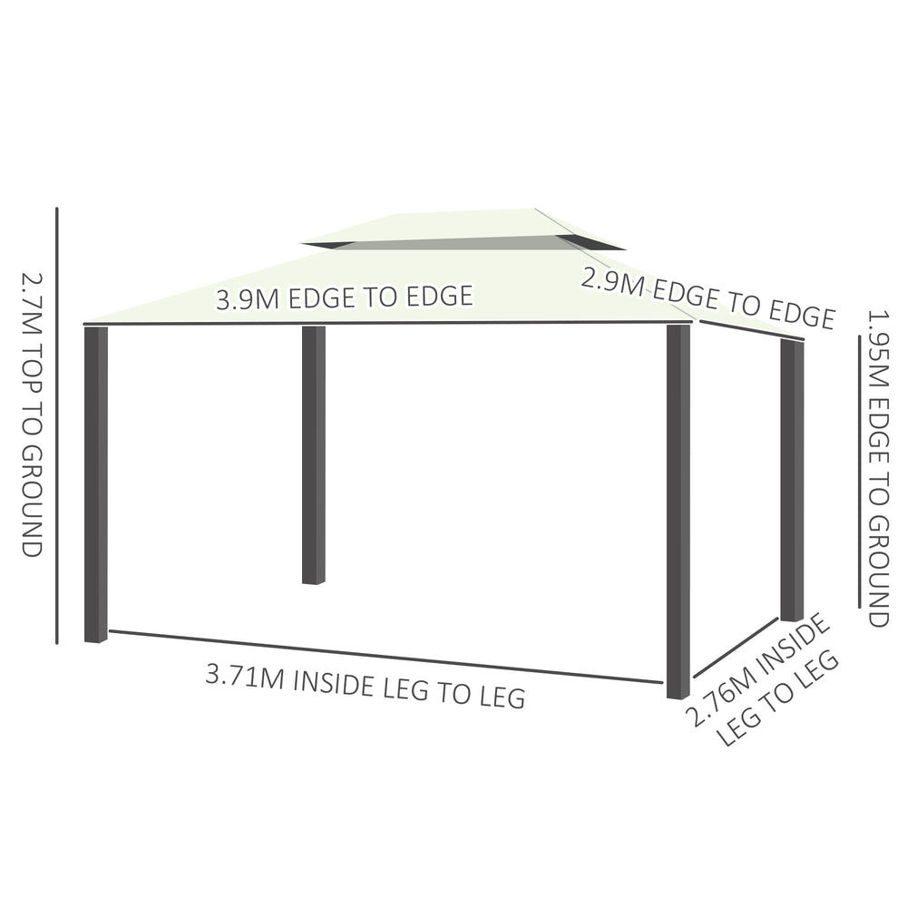 - ALUMINIUM GAZEBO DIMENSION: Overall Size: 3.9L x 2.9Wm, Top Height: 2.7m, Eaves Height: 1.95m, Column Spacing: 3.71L x 2.76Wm. NOTE: Accumulated snow must be removed from the roof.