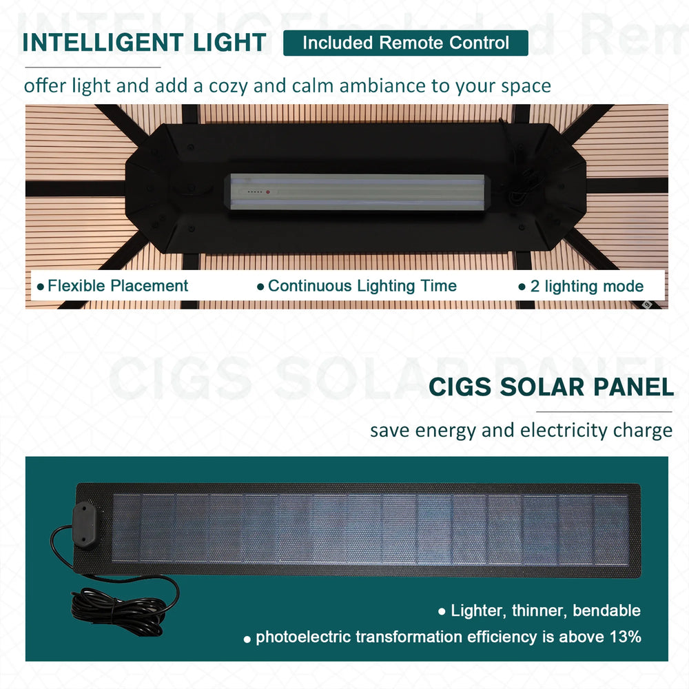 - ALUMINIUM GAZEBO: Made from rust resistant aluminium frame for stable and upright when in use. ENERGY SAVING: Using solar light is an effective way to save energy. Our CIGS solar board is lighter, thinner, bendable, its photoelectric transformation efficiency is above 13%.