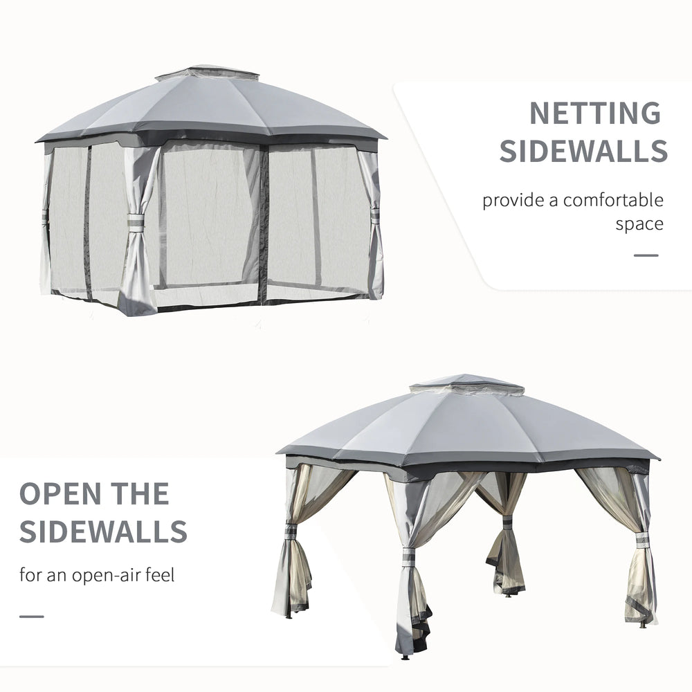 Outsunny 3.7 x 3(m) Metal Gazebo Canopy Party Tent Garden Patio Shelter with Netting Sidewalls & Double Tiered Roof, Grey