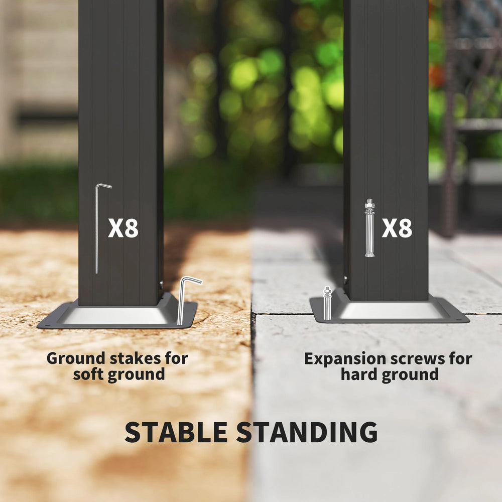 - Aluminium frame: A strong structure, pergola kit stands steadily in place. Eight ground nails and eight expansion screws included to secure to ground.