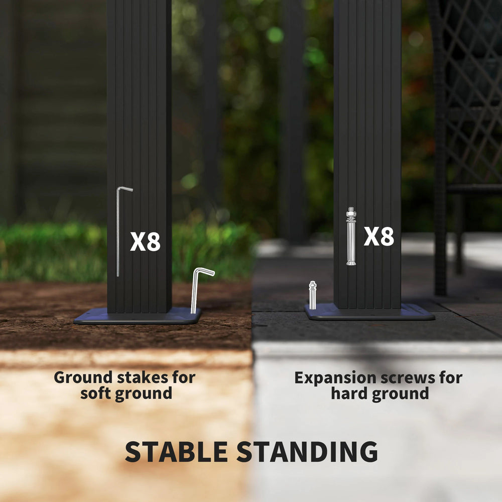 - Aluminium frame: A strong and rust-resistant structure, pergola kit stands steady in place. Eight ground nails and eight expansion screws included to secure to ground.