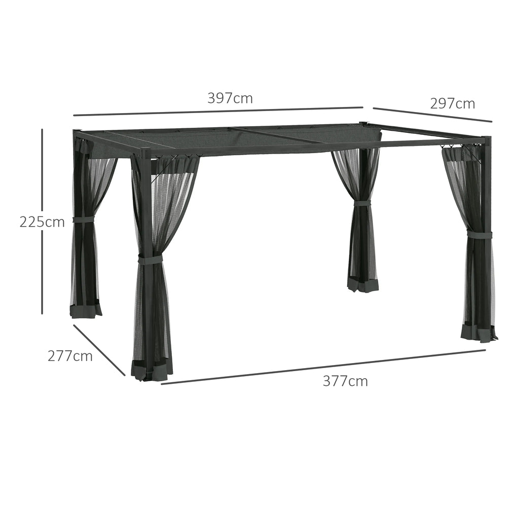 This Outsunny retractable pergola is a spacious outdoor shetler, which allows you to adjust the canopy as you desire - enjoy sunshine or relax in the shade. The aluminium structure is strong, with ground stakes and expansion screws included to keep it attached to the floor. Net curtains to protect inside from insects. Enjoy your outdoors better than ever before.