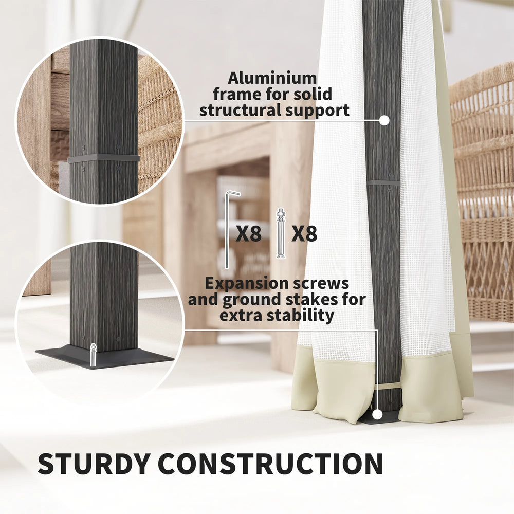 This Outsunny retractable pergola is a spacious outdoor shetler, which allows you to adjust the canopy as you desire - enjoy sunshine or relax in the shade. The aluminium structure is strong, with ground stakes and expansion screws included to keep it attached to the floor. Net curtains to protect inside from insects. Enjoy your outdoors better than ever before.