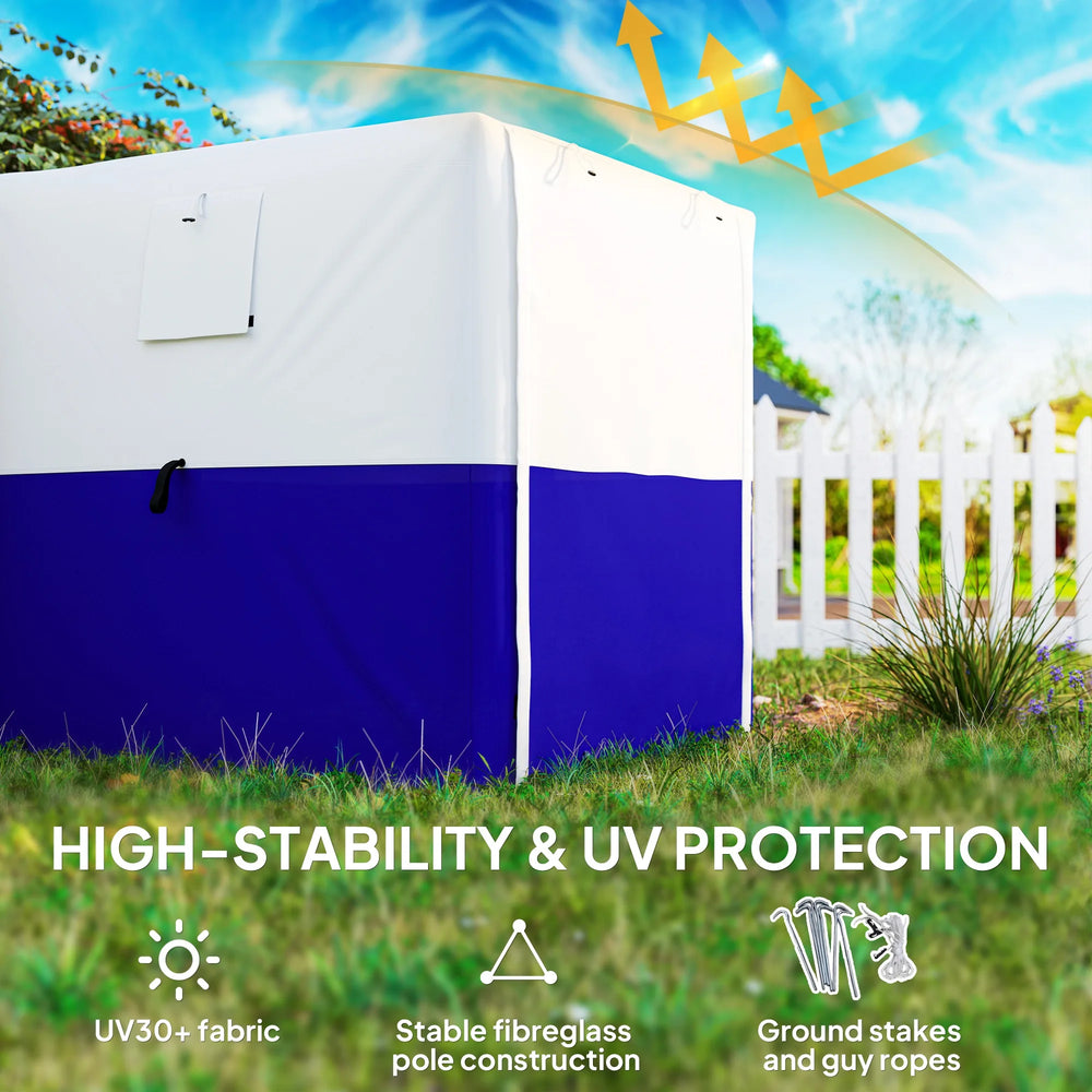 - Dimensions: 200H x 180L x 180Wcm. Eave: 178Hcm. Fits 2-3 people.