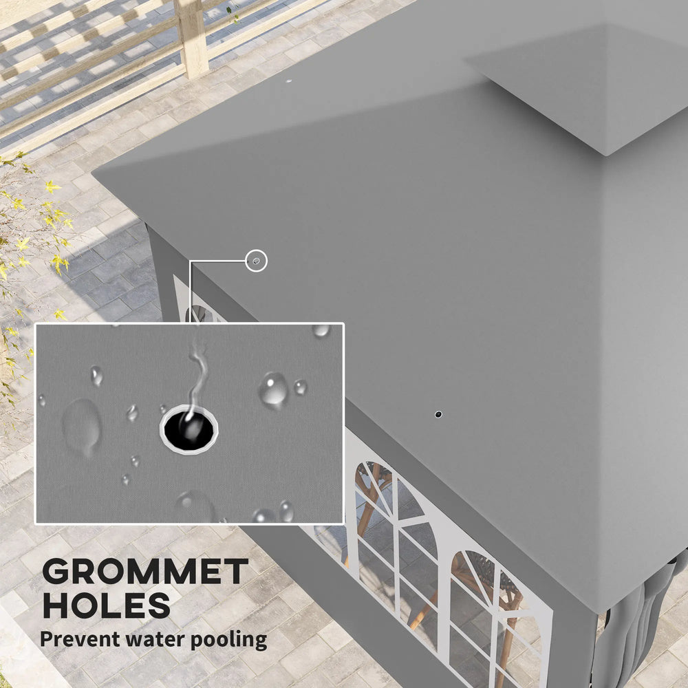 Elevate your outdoor gatherings with the Outsunny 3 x 3 m Garden Gazebo! This gazebo with sides fits 4-6 people and features a PA coated double-tier roof for superior UV protection and enhanced airflow. Splash-resistant material with grommet holes prevents water build-up, while removable sidewalls with clear windows offer privacy and panoramic views, making it a must-have garden shelter.