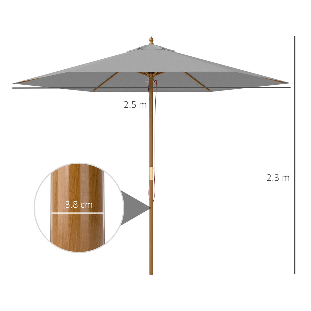 Outsunny 2.5m Wood Garden Parasol Sun Shade Patio Outdoor Wooden Umbrella Canopy, Table Market Umbrella with Vent, 38mm Pole, Rope Pulley Mechanism, Light Grey