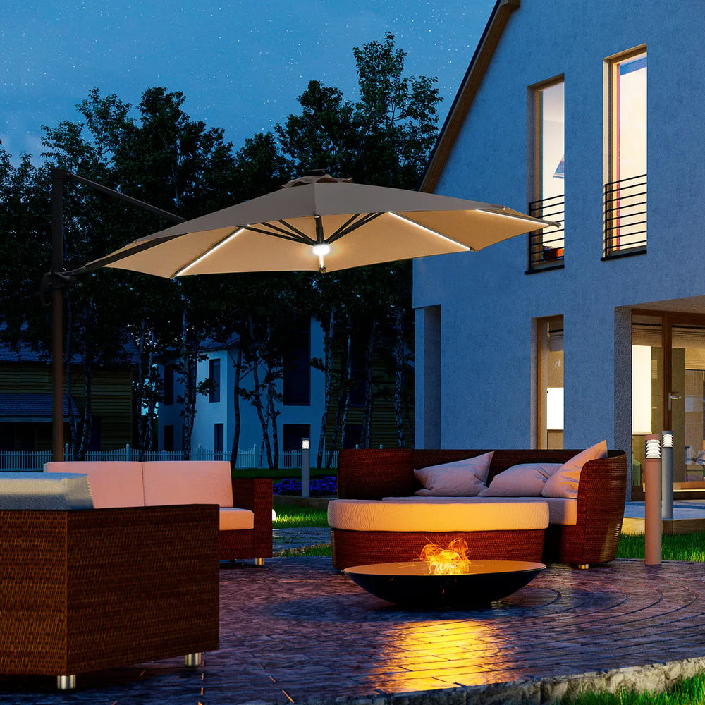 - SOLAR POWERED LED LIGHTS: Placed on the support ribs of the led parasol, they illuminate your garden beautifully at night - great for extending time outdoors. Charge in the sunlight, controlled by a switch.