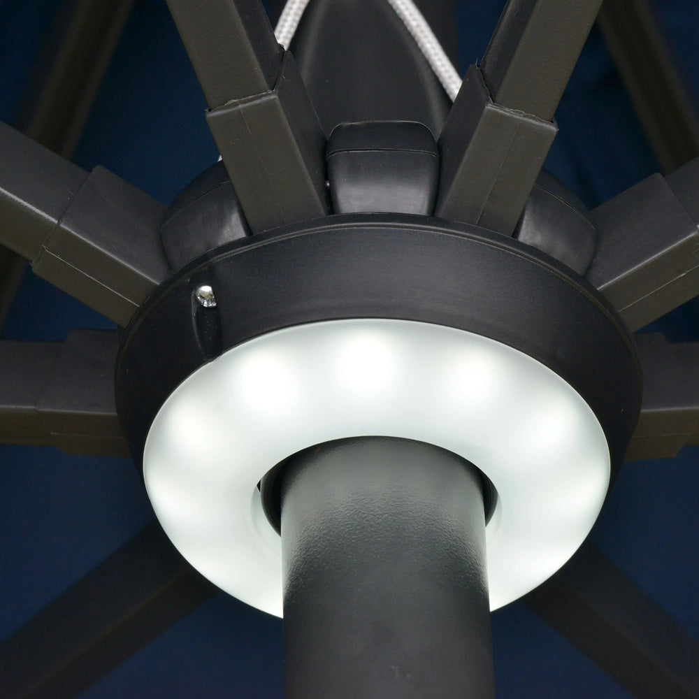 Keep yourself protected whilst enjoying the sun all day long with this sun umbrella from Outsunny. The polyester canopy provides protection from direct sunlight and heat. Using a crank mechanism for effortless opening and closing, the umbrella pole can be easily tilted to maximize your shade. Powered by panel solar, the LED lights on the ribs can provide you more lights at night. The perfect blend of beauty and function.