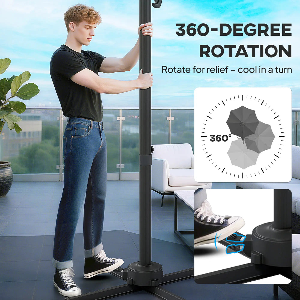 - 360 ROTATING: With cross base and a foot pedal on it to control its rotation, the base offers a 360-degree rotation for easier shading area control. (Note: Only a cross base included with the led parasol, no counterweight base. It is recommended to use a counterweight above 90-110kg)