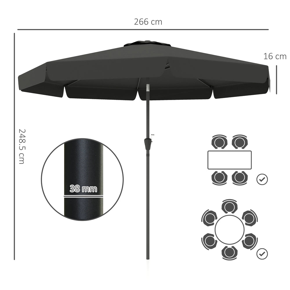 The Outsunny parasols umbrellas are an ideal choice to enjoy the shade in sunny days. It tilts to many different positions, so you can keep protection no matter where you sit. The 2.66m diameter sunshades for garden cover between 4-6 people, so you can enjoy your garden with family and friends. It covers your party from the rain and sunlight, giving you cover as you dine outdoors. Base not included - our Outsunny standard (not Cantilever) bases will suit.