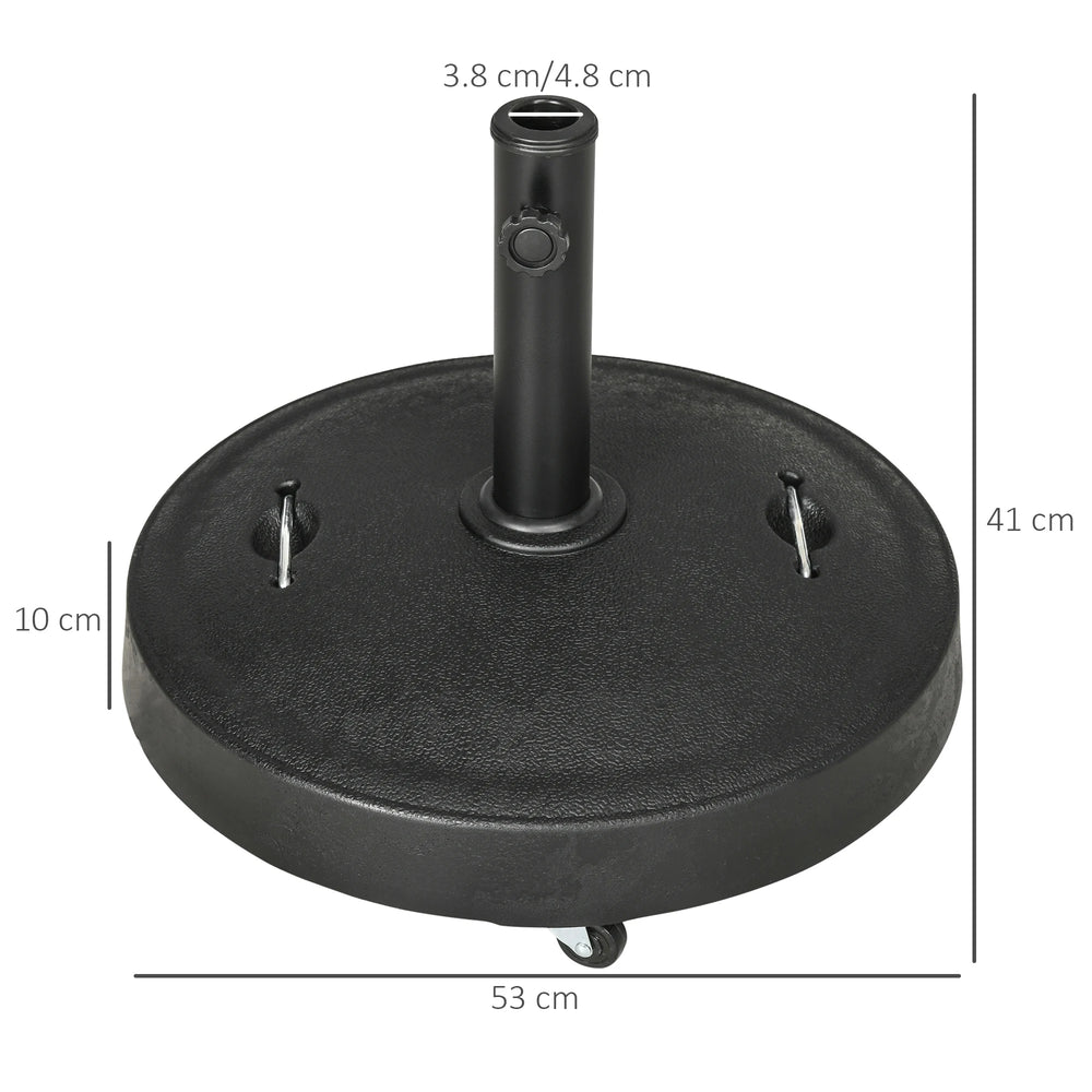 Outsunny 23.5kg Resin Garden Parasol Base with Wheels and Retractable Handles, Round Outdoor Market Umbrella Stand Weight for Poles of 38mm to 48mm, Black