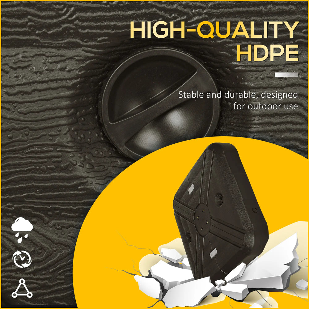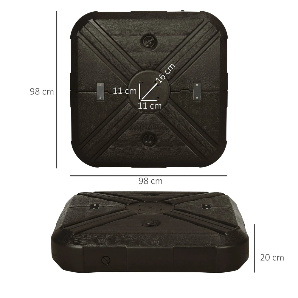 Ensure your 360 rotating patio offset umbrella is always held firmly in place with the base for cantilever parasol from Outsunny. Made from strong HDPE, it needs to be filled with water or sand to increase the weight, keeping stability outdoors. Comes with smooth wheels, easy to move around. Whether you wish to use this for the garden, patio, or poolside, this is the parasol base for you. Combine our umbrella weight base with a cantilever roma umbrella and create your own oasis under shade.