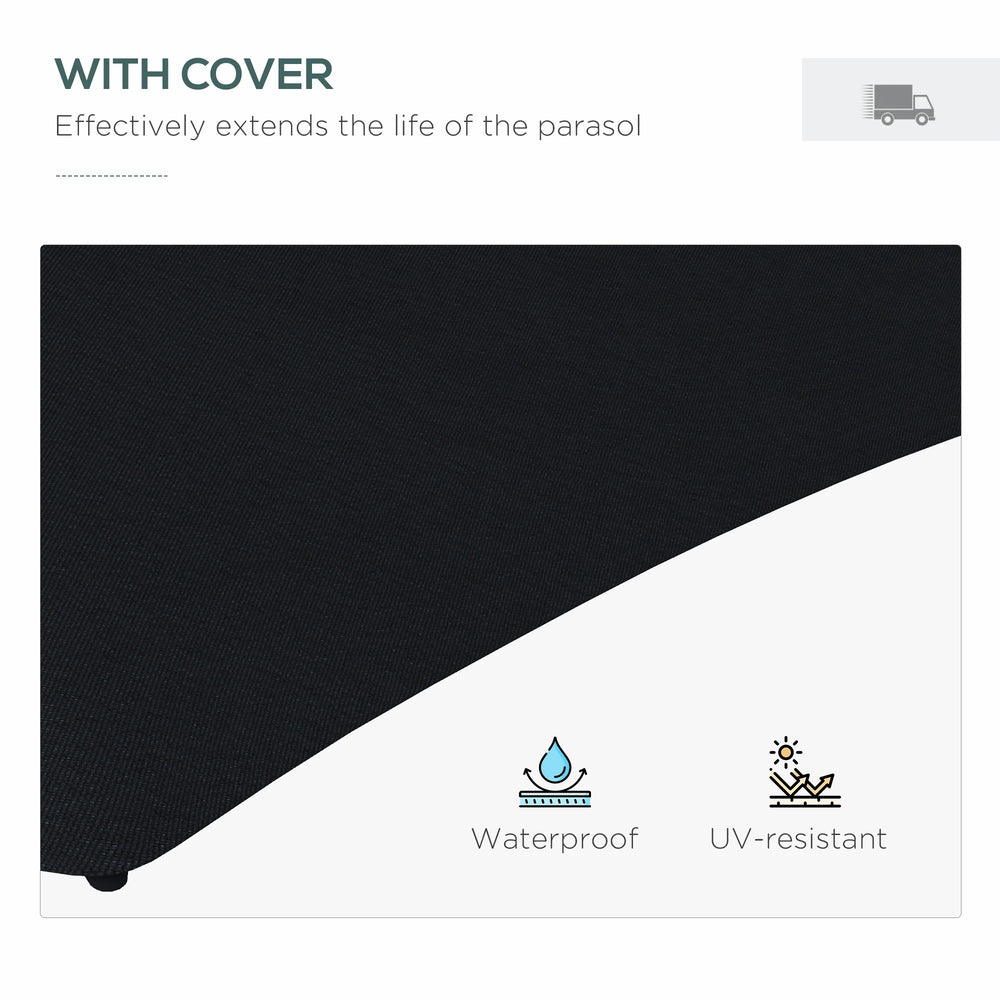 From day to night with this Outsunny parasol umbrella. Showcasing solar-powered LED lights on the ribs: charges in the day to light up at night; extend your outdoor time beautifully. Cross base included, 60kg required weights are required.